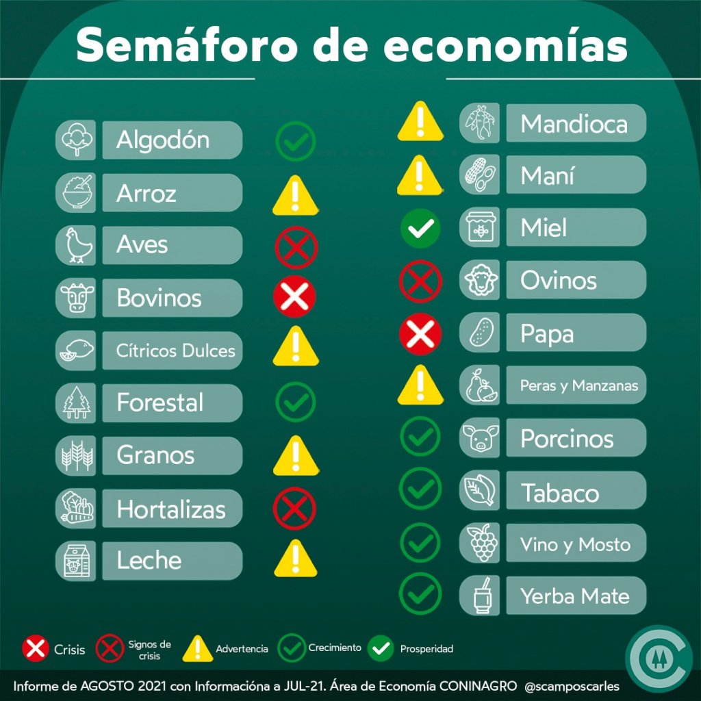 Coninagro dio a conocer su semáforo mensual de economías regionales correspondiente a julio de este año en el cual realiza un relevamiento de 19 actividades productivas de la Argentina de las cuales 5 se encuentran en un estado de crisis o mostrando signos críticos, 7 marcan una señal de advertencia, y 7 de ellas están en buen estado.