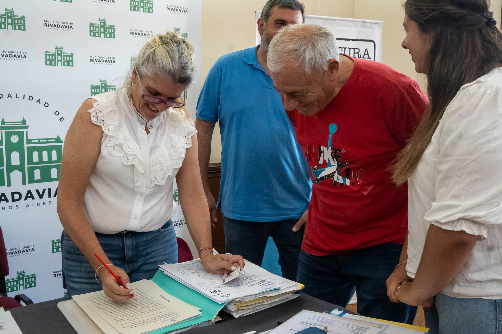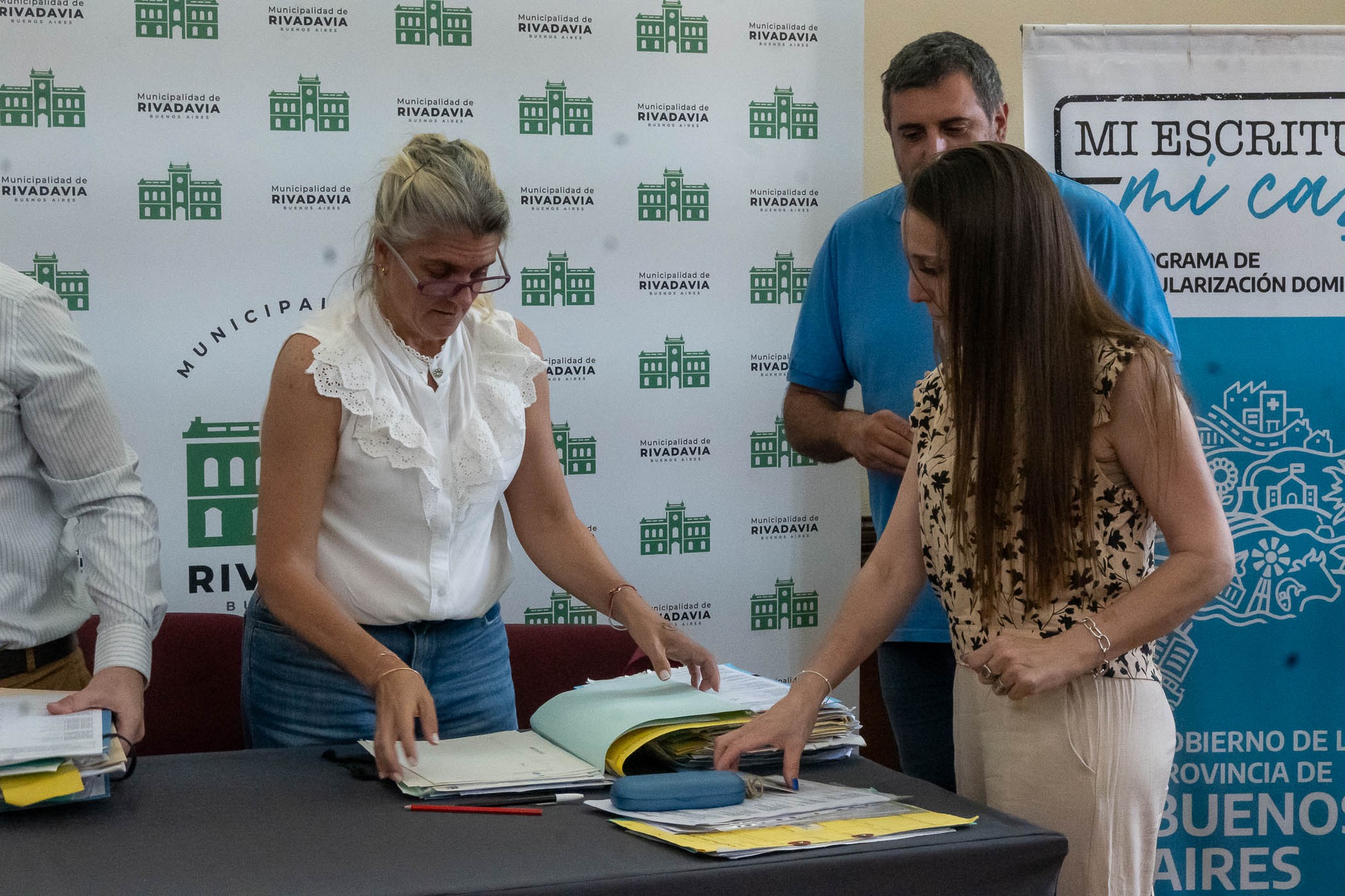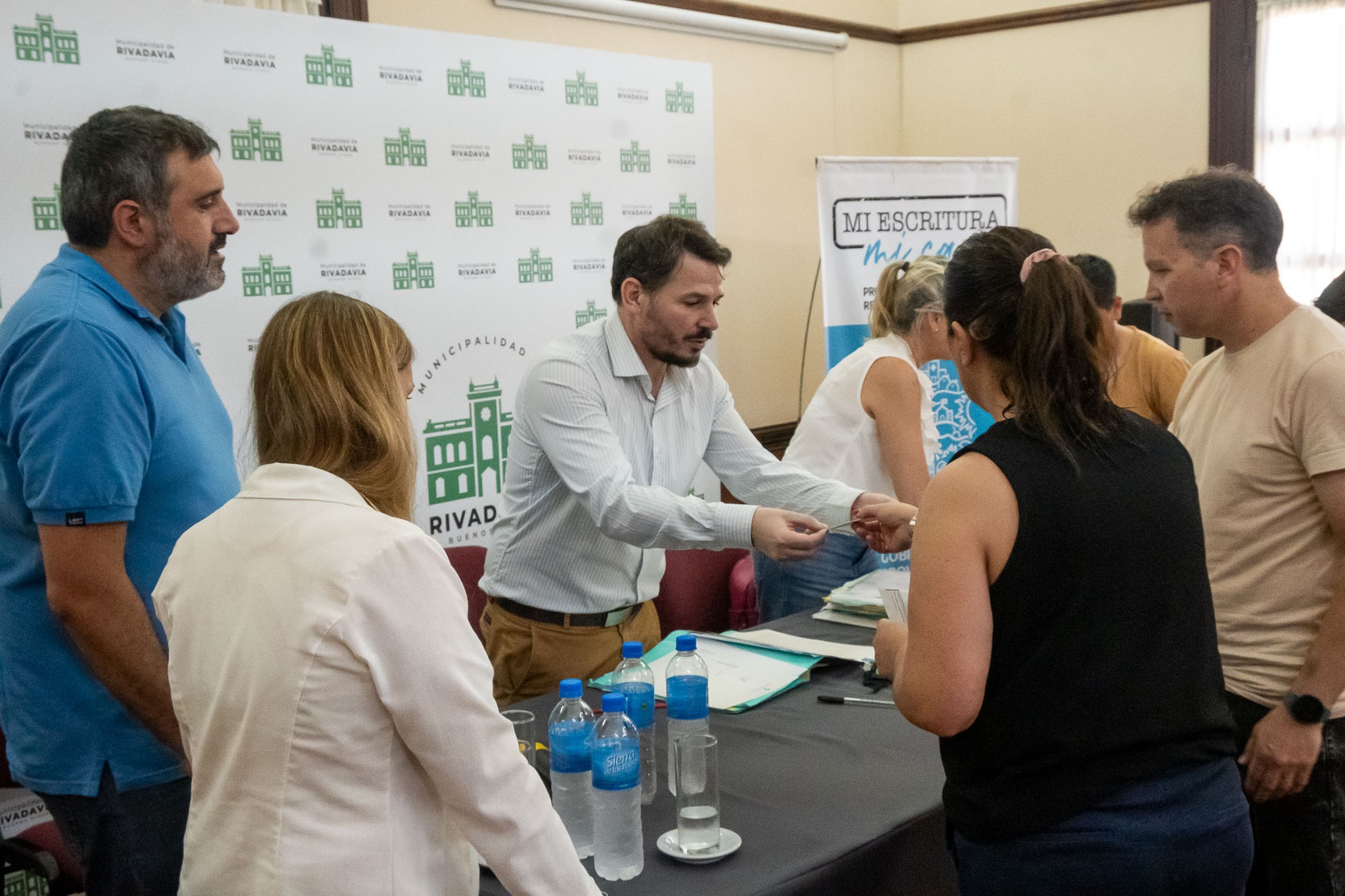 El secretario de Gobierno Sebastián Hernández, junto a los escribanos Paulo Guidi y María Laura Mattioli, en representación de la Escribanía General de Gobierno de la Provincia de Buenos Aires, encabezaron el acto de toma de firma a 21 vecinos de Rivadavia, en el marco del programa provincial “Mi Escritura, Mi Casa”, para avanzar en la tramitación gratuita de sus escrituras.