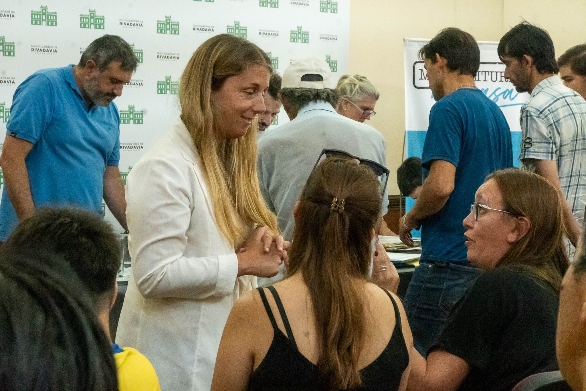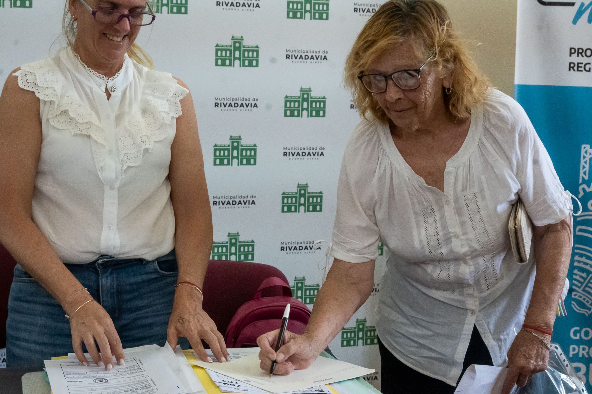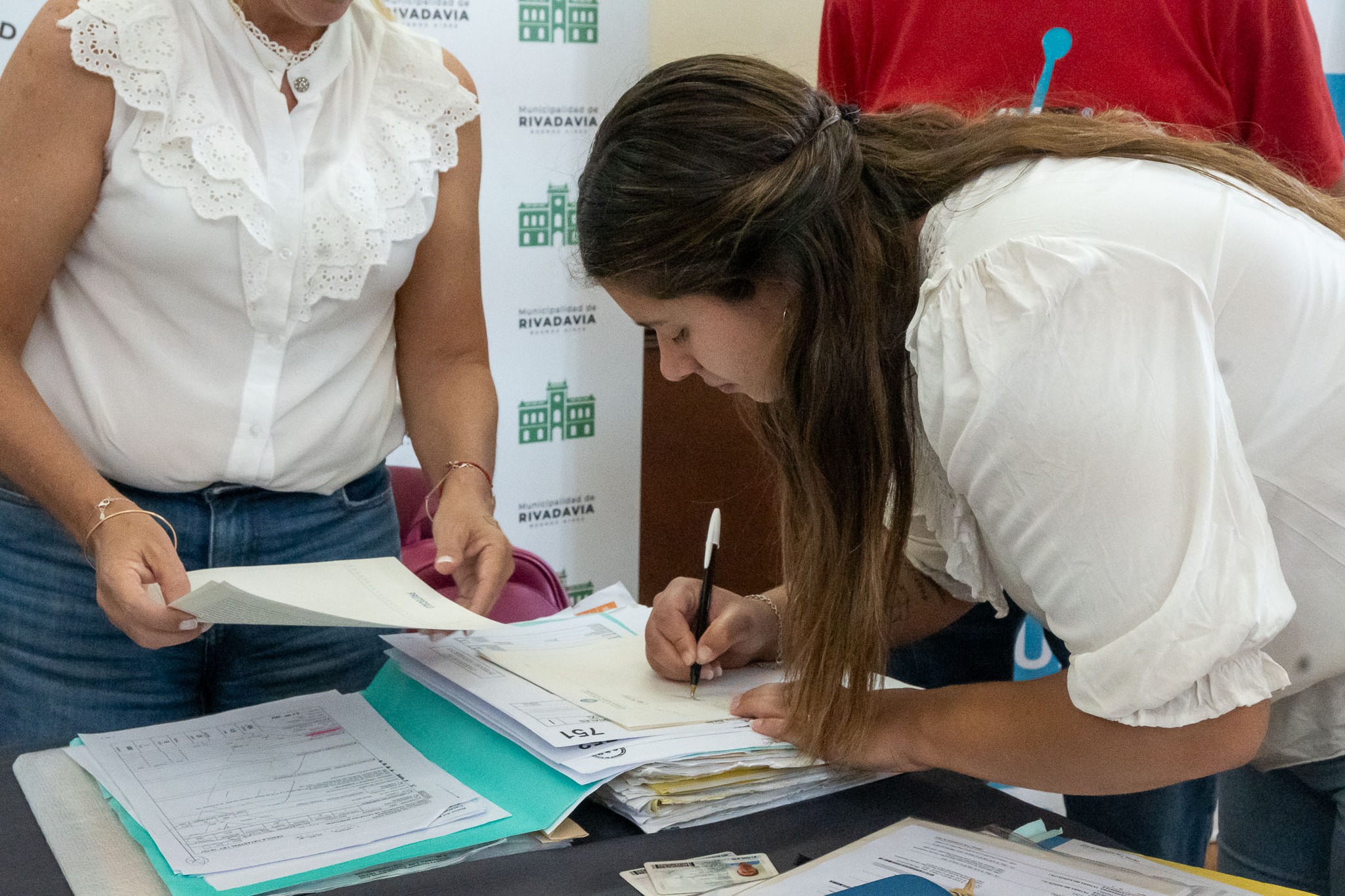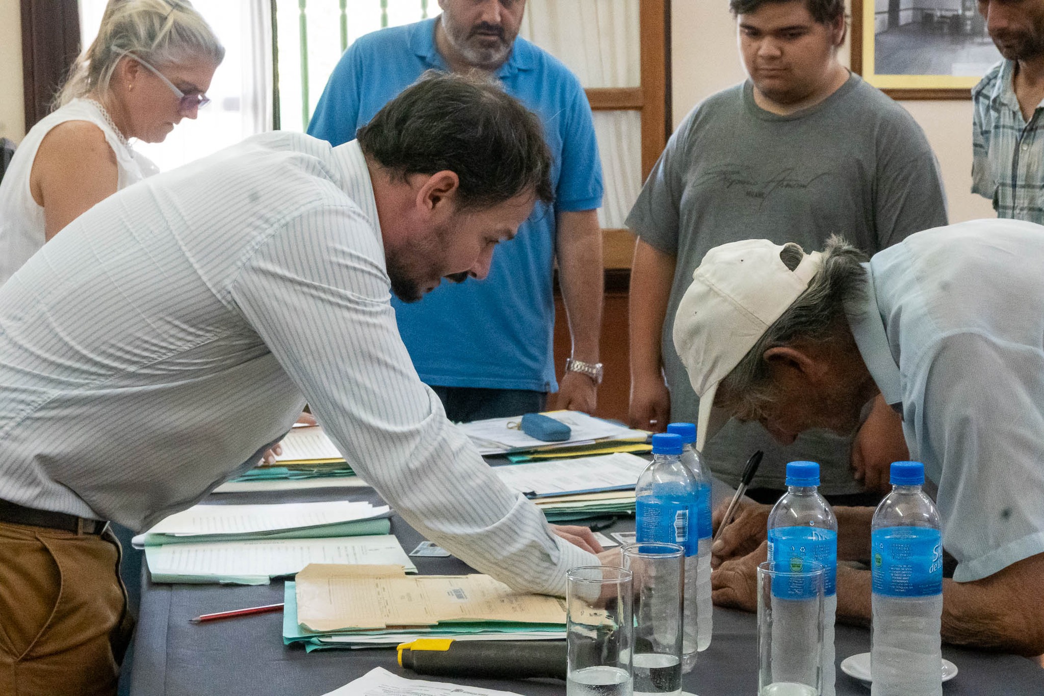 El secretario de Gobierno Sebastián Hernández, junto a los escribanos Paulo Guidi y María Laura Mattioli, en representación de la Escribanía General de Gobierno de la Provincia de Buenos Aires, encabezaron el acto de toma de firma a 21 vecinos de Rivadavia, en el marco del programa provincial “Mi Escritura, Mi Casa”, para avanzar en la tramitación gratuita de sus escrituras.