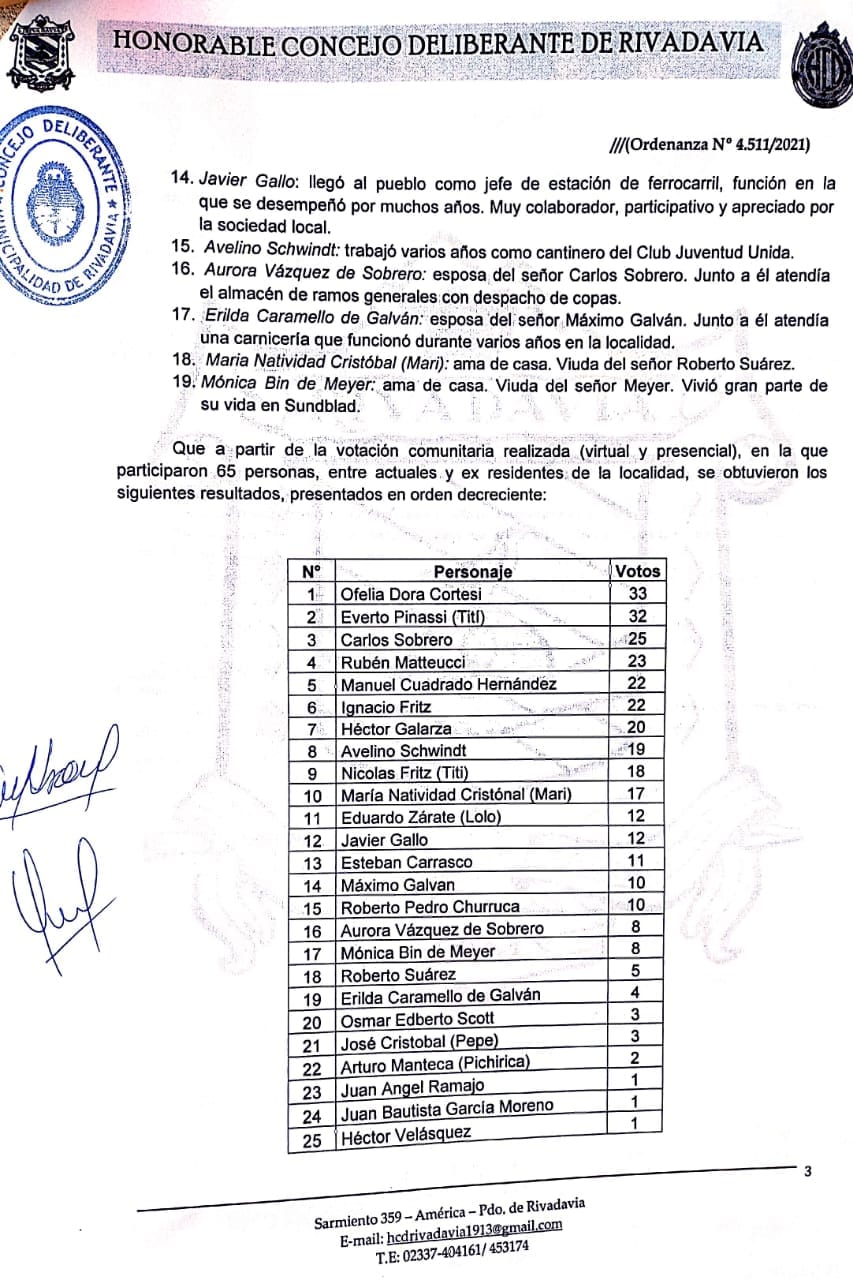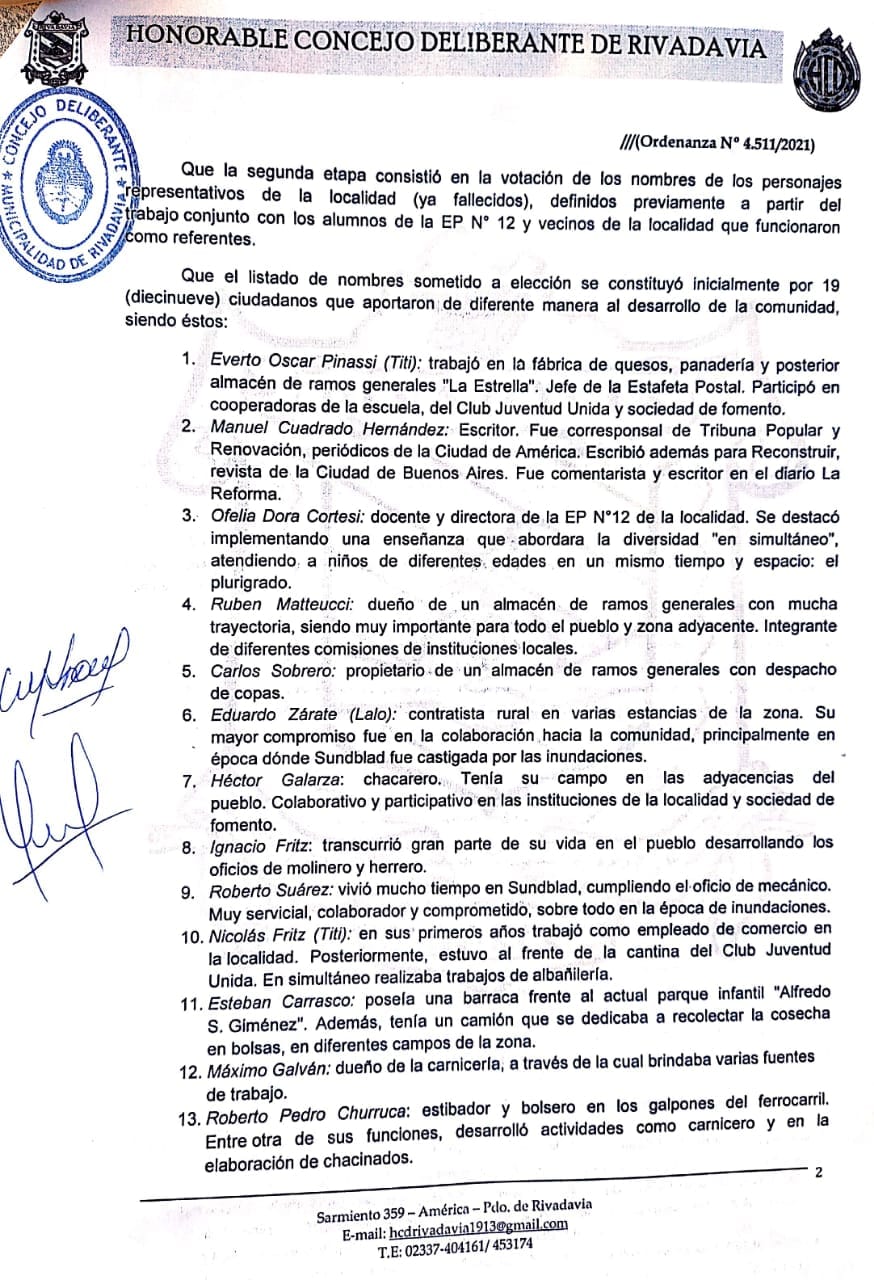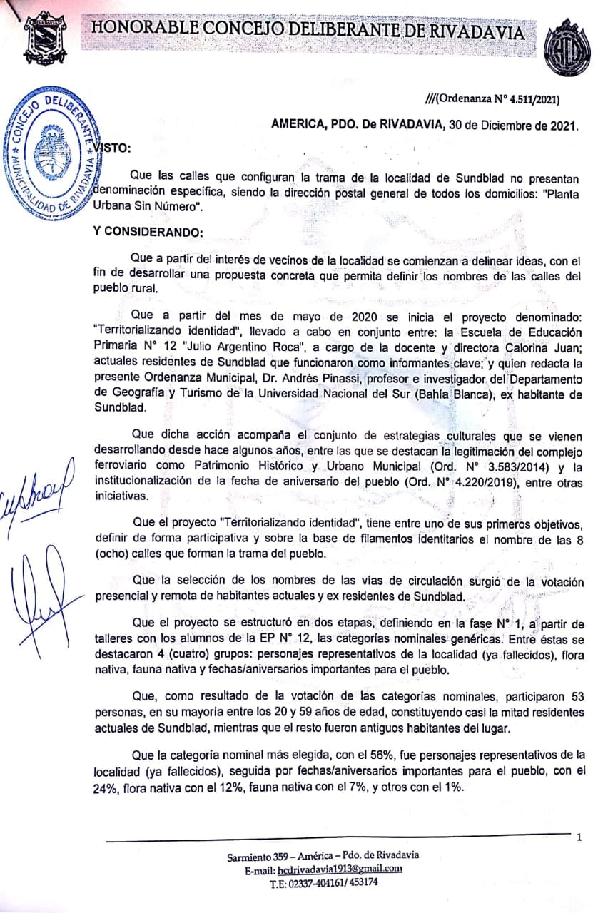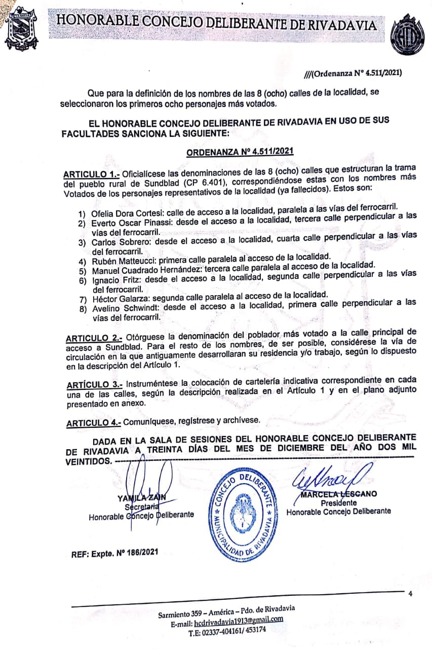 El jueves por la tarde en la última Sesión Pública del período 2021 el Honorable Concejo Deliberante de Rivadavia, aprobó por unanimidad la Ordenanza Municipal 4.511/21, que oficializa las denominaciones de las calles de la localidad de Sundblad.