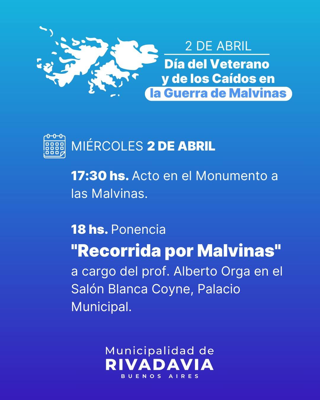 🕙 18:00 hs. Charla “Recorrida por Malvinas” a cargo del Prof. Alberto Orga. En el Salón Blanca Coyne del Palacio Municipal.