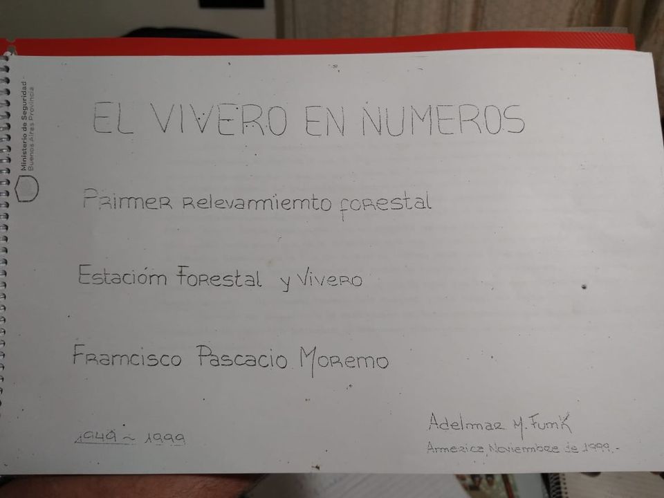 La obra se titula “El Vivero en Números” y en su tapa se puede leer – Primer Relevamiento Forestal – Estación Forestal y Vivero Francisco Pascacio Moreno – 1949 – 1999 – Adelmar M. Funk – América – Noviembre de 1999.