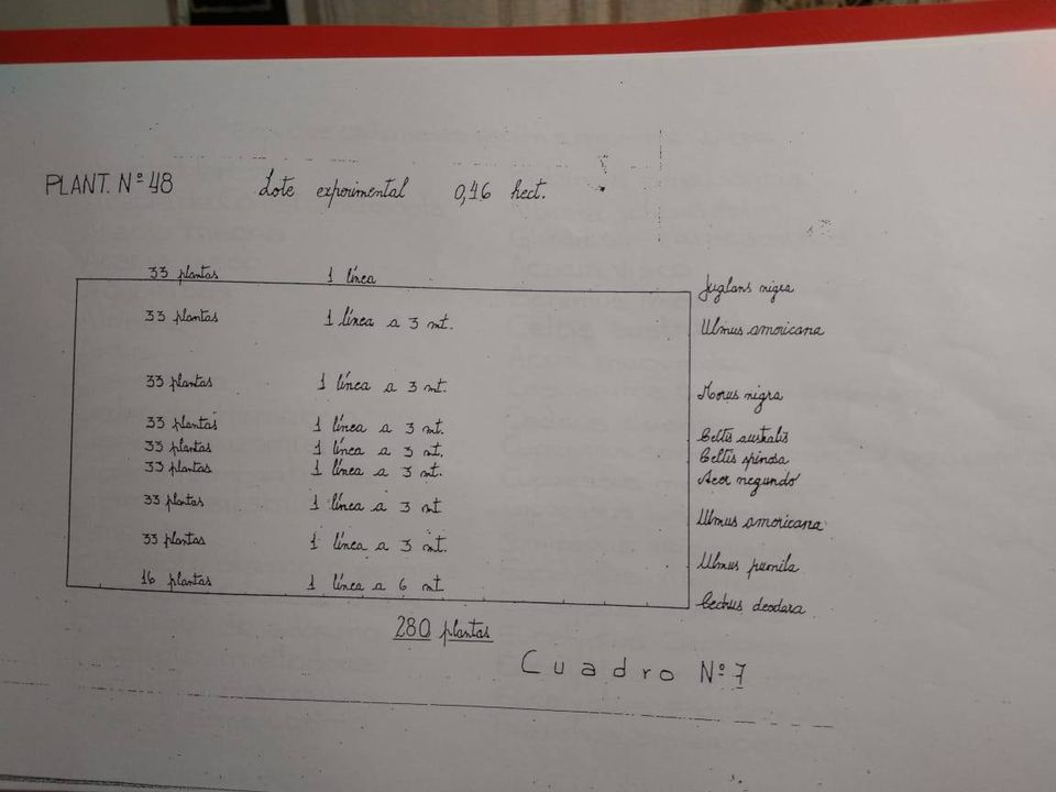 En este trabajo se puede encontrar la información de todo lo que fue cultivado desde el año 1949 hasta 1961, año este en que se plantó la última parcela. Allí También se detallan todas las especies cultivadas con sus nombres vulgares y científicos, fechas de cultivo, distancias de cultivo, tamaño de parcelas, ubicación de parcelas, especies de aparición espontánea, invasoras, etc. etc.