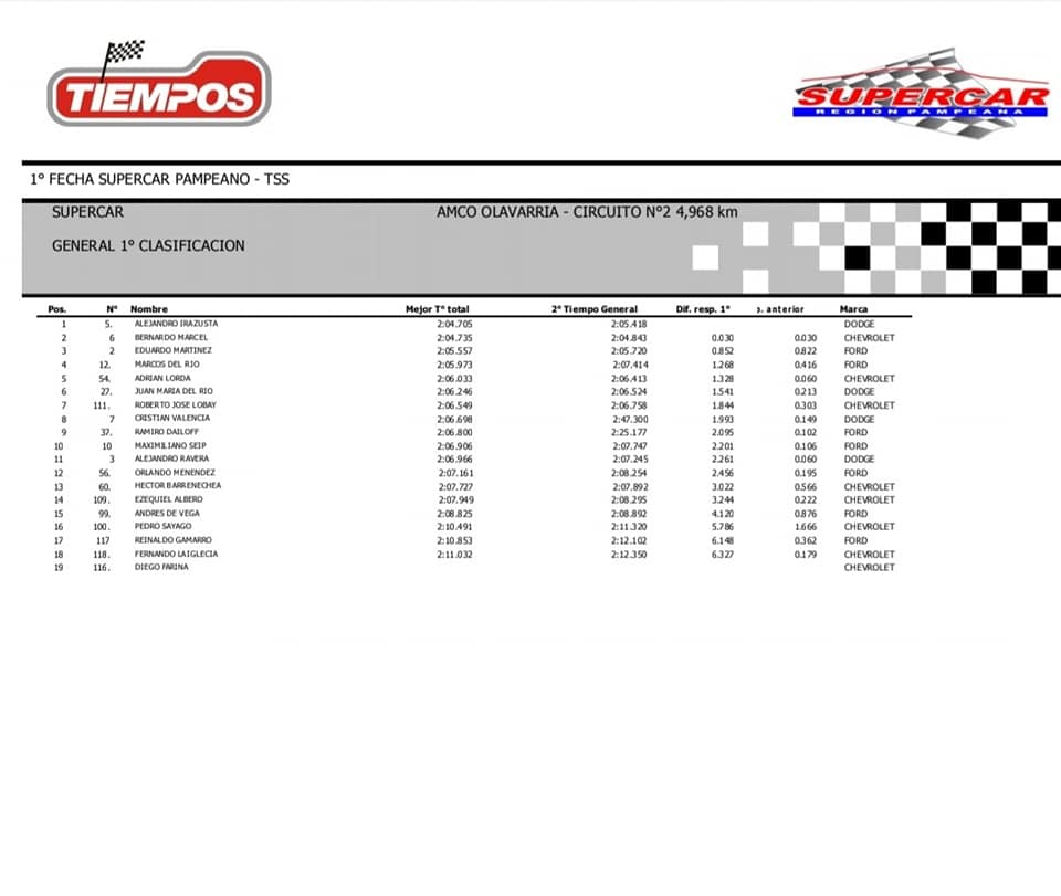Alejandro Irazusta de América con la Dodge que le alista el Guindani Racing, fue el más rápido en el circuito olavarriense donde se corre el Premio Caldenia ART entre los 19 pilotos participantes