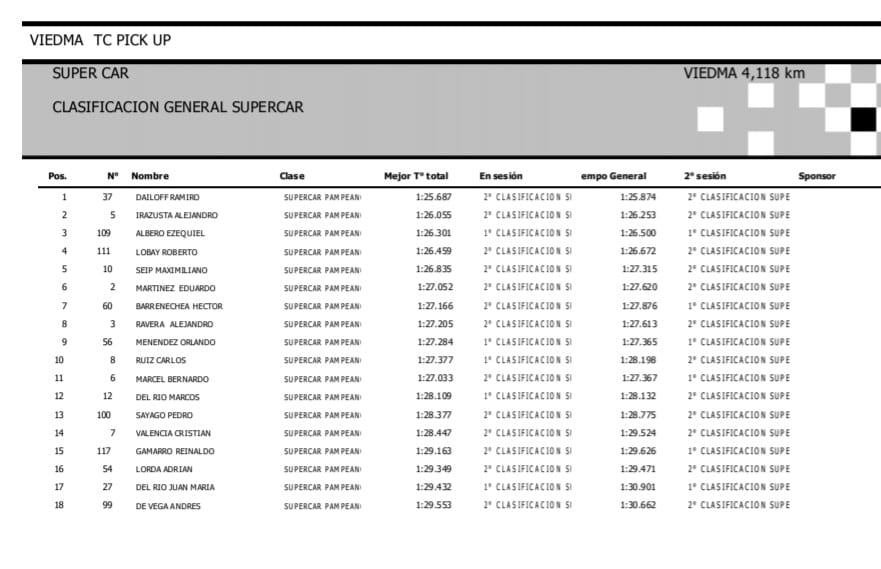 El piloto de América, puntero absoluto en el Supercar tuvo este sábado una muy buena performance en la tanda de clasificación de la carrera que se disputa en el Autodromo de Viedma en la Provincia de Rio Negro junto a las las TC Pickup. En la primer tanda de clasificación había terminado en el 4° lugar