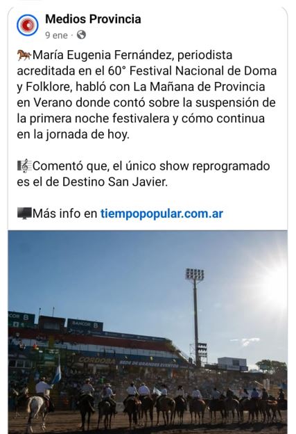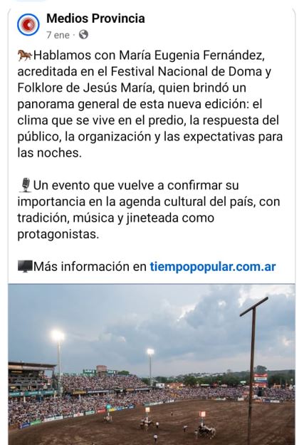La rivadaviense María Eugenia Fernández, quien desde hace años reside en Trenque Lauquen, fue la única periodista de la región acreditada en el 60.° Festival Nacional de Doma y Folklore de Jesús María.