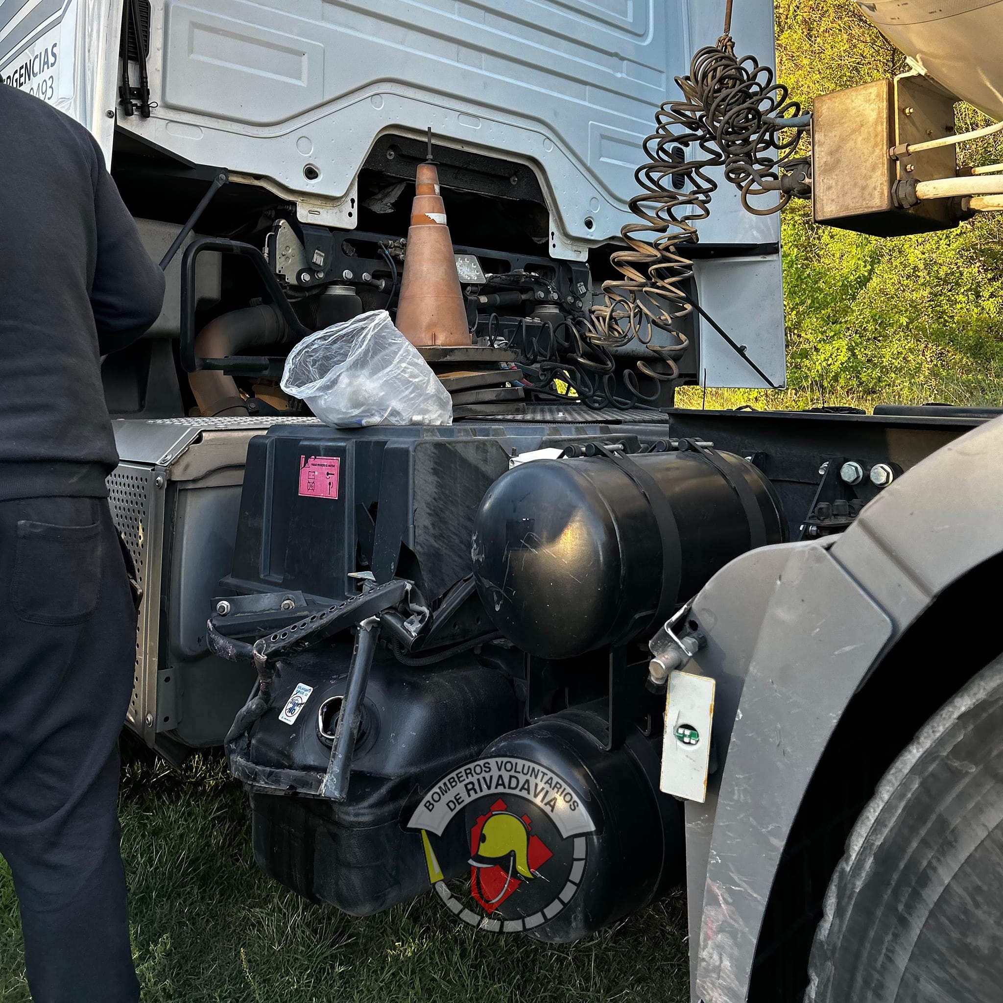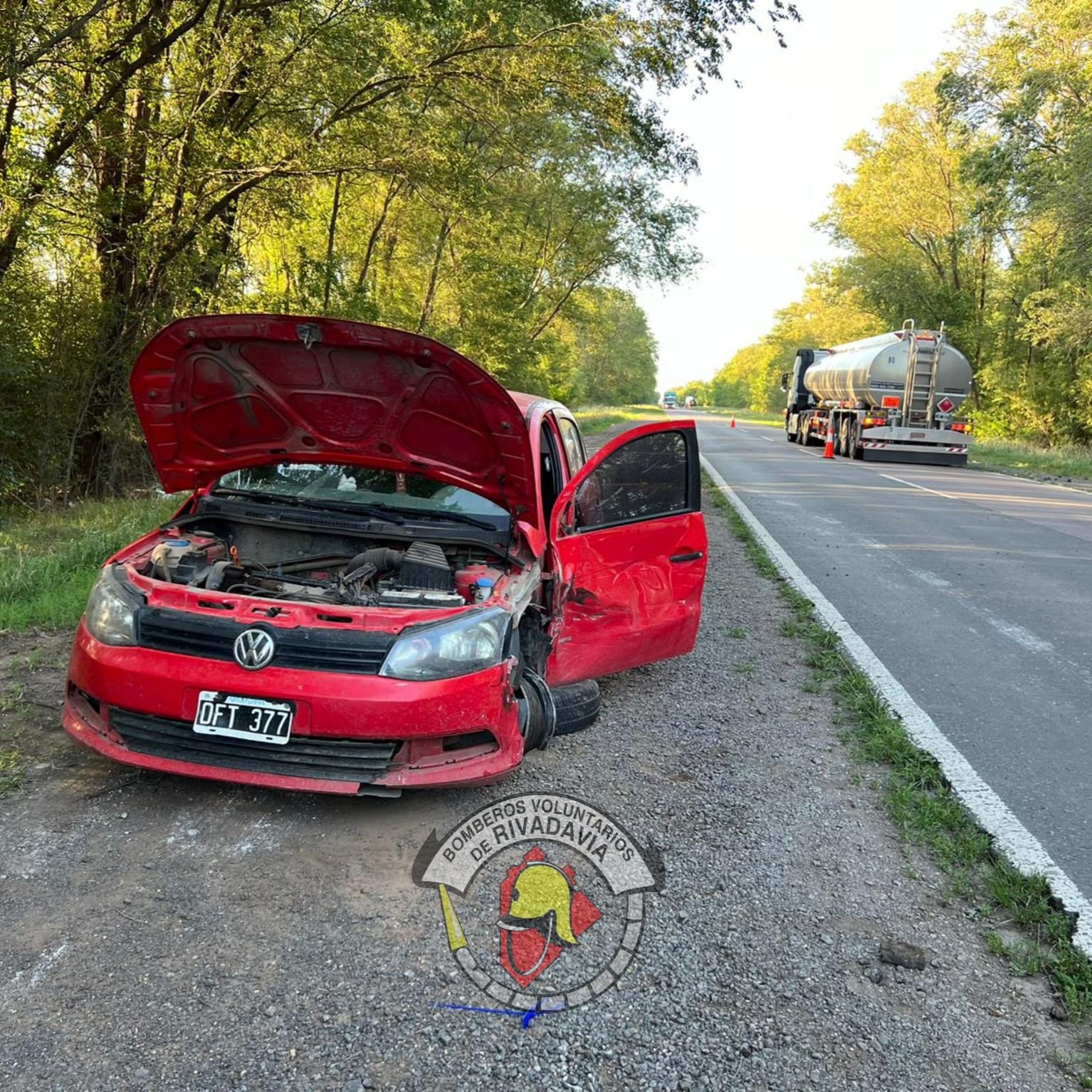 Desde Bomberos Voluntarios de Rivadavia contaron “Acudimos a ruta nacional 33 en dirección a Fortin Olavarria. A un lado de la ruta encontramos un automóvil VW gol trend con una de sus cubiertas rota y golpes en carrocería, mientras que al otro lado de la cinta asfáltica, un camión cisterna Mercedes Benz en condiciones de continuar marcha”.