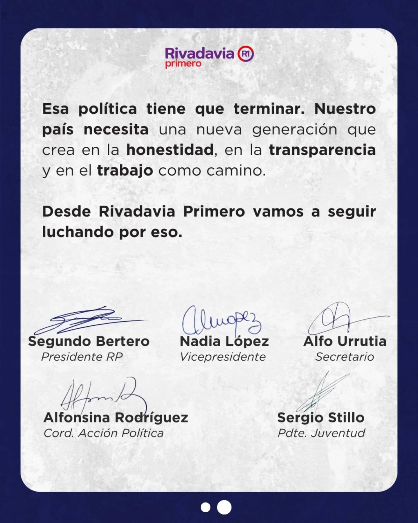 Esa pol铆tica tiene que terminar. Nuestro pa铆s necesita una nueva generaci贸n que crea en la honestidad, en la transparencia y en el trabajo como camino. Desde Rivadavia Primero vamos a seguir luchando por eso.