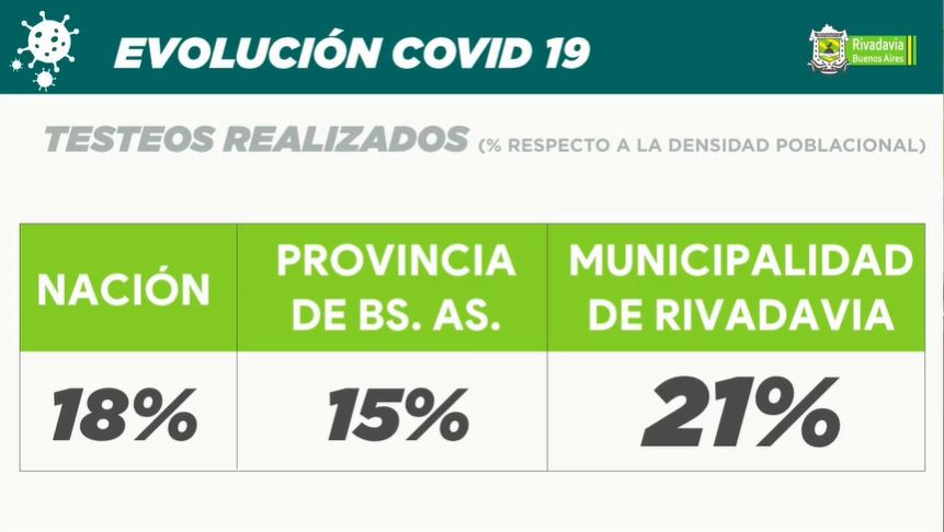 El Intendente mostró algunos gráficos “Hoy es escenario es mejor sobre todo si tenemos en cuenta los casos recuperados sobre los positivos. Además en el tema testeo aquí en Rivadavia se supera en el porcentual con el 21% a Nación que tiene el 18% y a Provincia con el 15%.
