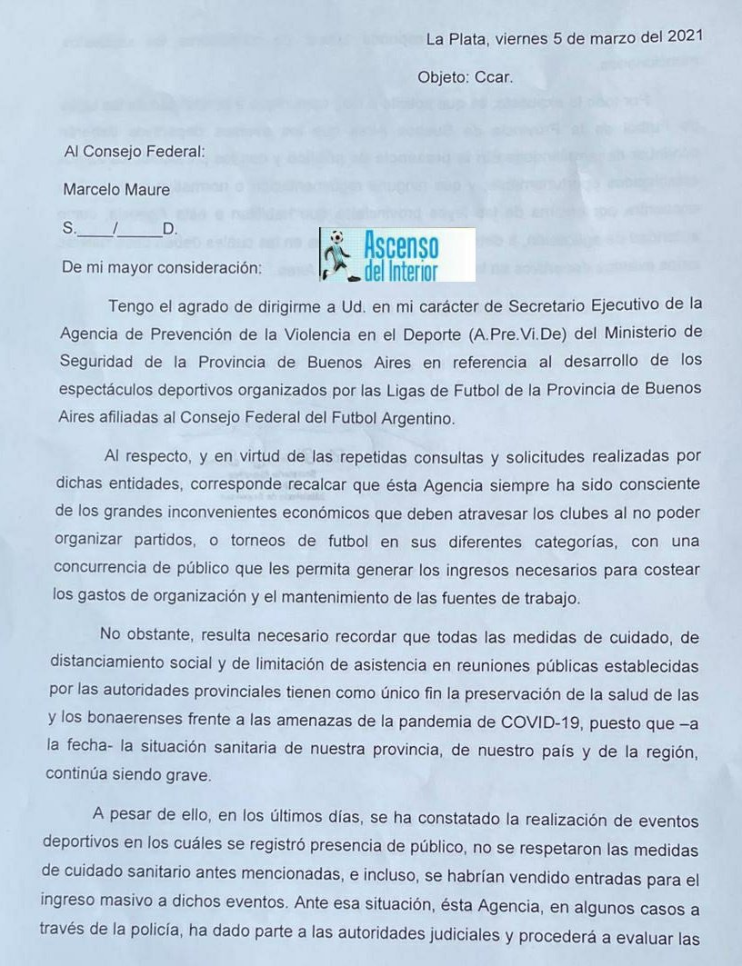 Tengo el agrado de dirigirme a Ud, en mi caracter de Secretario Ejecutivo de la Agencia de Prevención de la Violencia en el Deporte (A Pre Vi.De) del Ministerio de Seguridad de la Provincia de Buenos Aires en referencia al desarrollo de los espectáculos deportivos organizados por las Ligas de Fútbol de la Provincia de Buenos Aires afiliadas al Consejo Federal del Fútbol Argentino