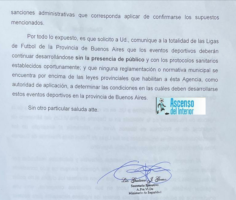 Por todo lo expuesto, es que solicito a Ud., comunique a la totalidad de las Ligas de Fútbol de la Provincia de Buenos Aires que los eventos deportivos deberán continuar desarrollándose sin la presencia de público y con los protocolos sanitarios establecidos oportunamente, y que ninguna reglamentación o normativa municipal se encuentra por encima de las leyes provinciales que habilitan a ésta Agencia, como autoridad de aplicación, a determinar las condiciones en las cuales deben desarrollarse estos eventos deportivos en la provincia de Buenos Aires.