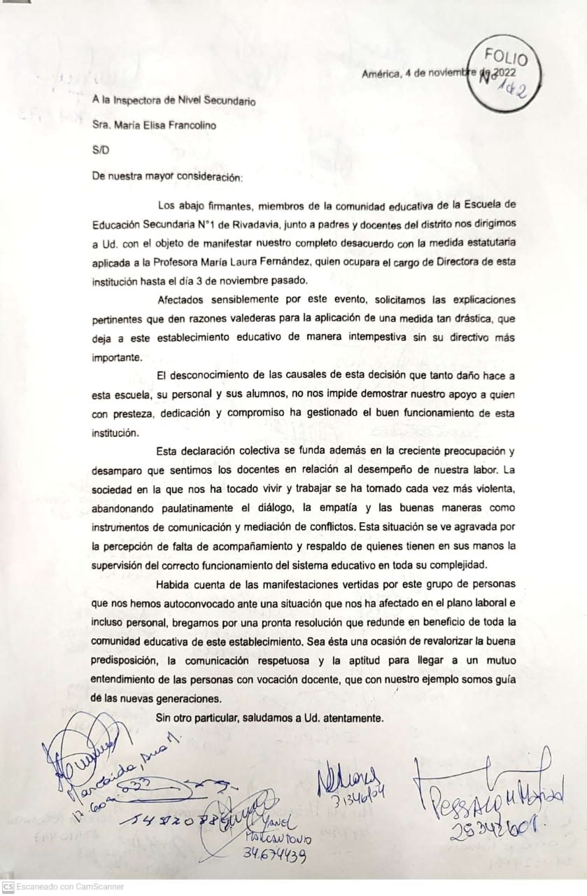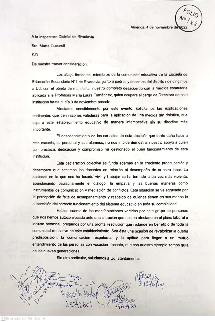 En los últimos días se conoció la información de que la Directora de la Escuela Secundaria N° 1 de Rivadavia la Prof. Laura Fernández había sido separada de su cargo por decisión de las autoridades educativas. Compañeros de trabajo, padres y alumnos piden por la restitución de su cargo.