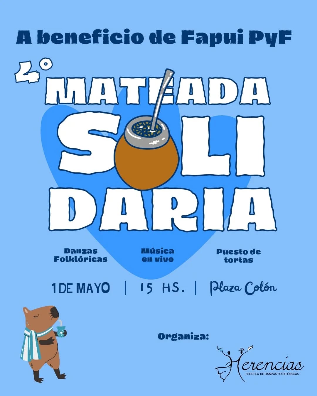 Organizado por la Escuela de Danzas Folkloricas Herencia el jueves 1° de mayo la movida comenzará con una choripaneada para continuar con una colecta de alimentos y artículos de limpieza para Fapui. Además, habrá música en vivo, danzas, puestos de tortas y mucho más en Plaza Colón.