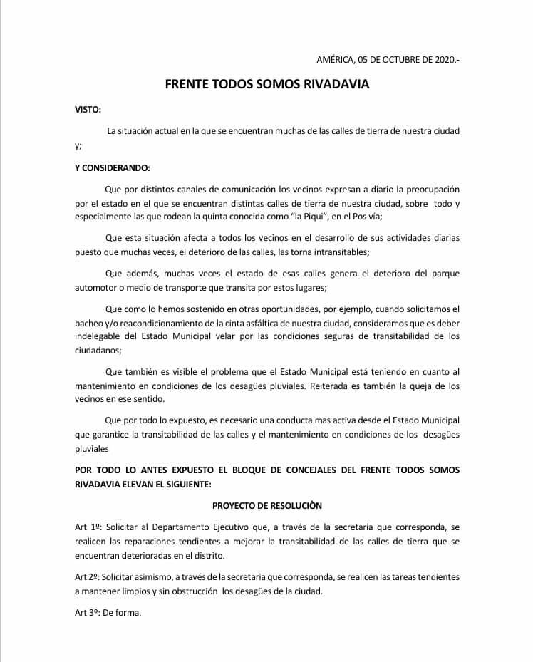 Los ediles de la oposición contaron “Atento el mal estado de las calles de tierra de nuestra ciudad, sobre todo las que rodean la quinta “La Piqui” en el sector del pos via y teniendo en cuenta lo dificultoso que se torna el tránsito para los vecinos que viven en esa zona, en el día de ayer presentamos un proyecto de resolución solicitándole al Departamento Ejecutivo que se realicen las reparaciones tendientes a mejorar la transitabilidad de las calles de tierra que se encuentran deteriorada”