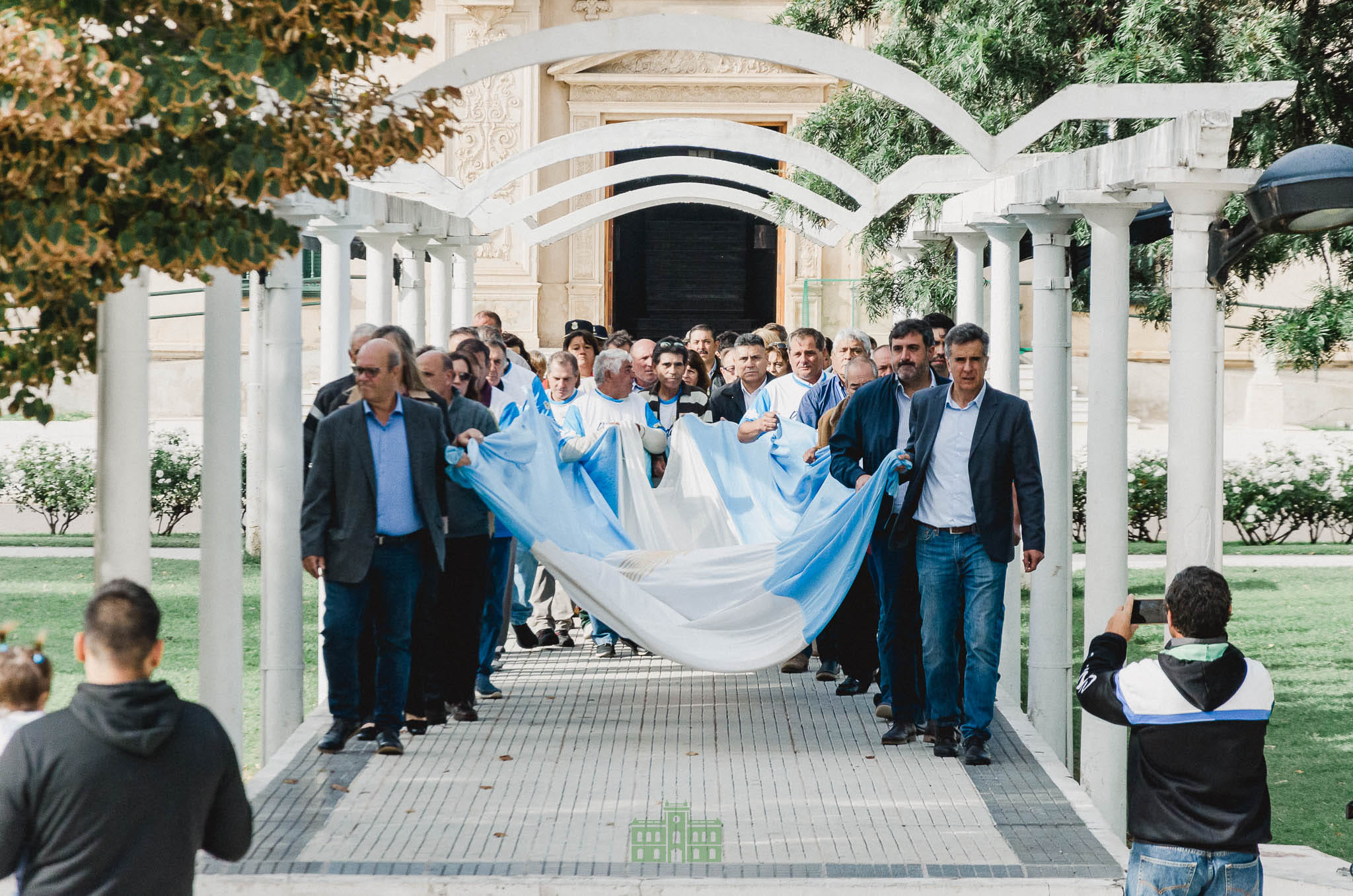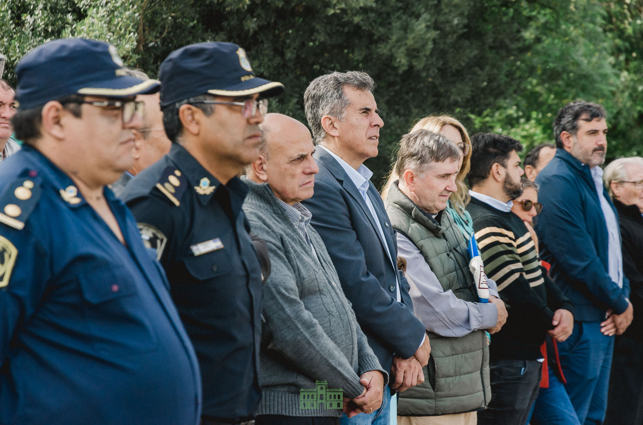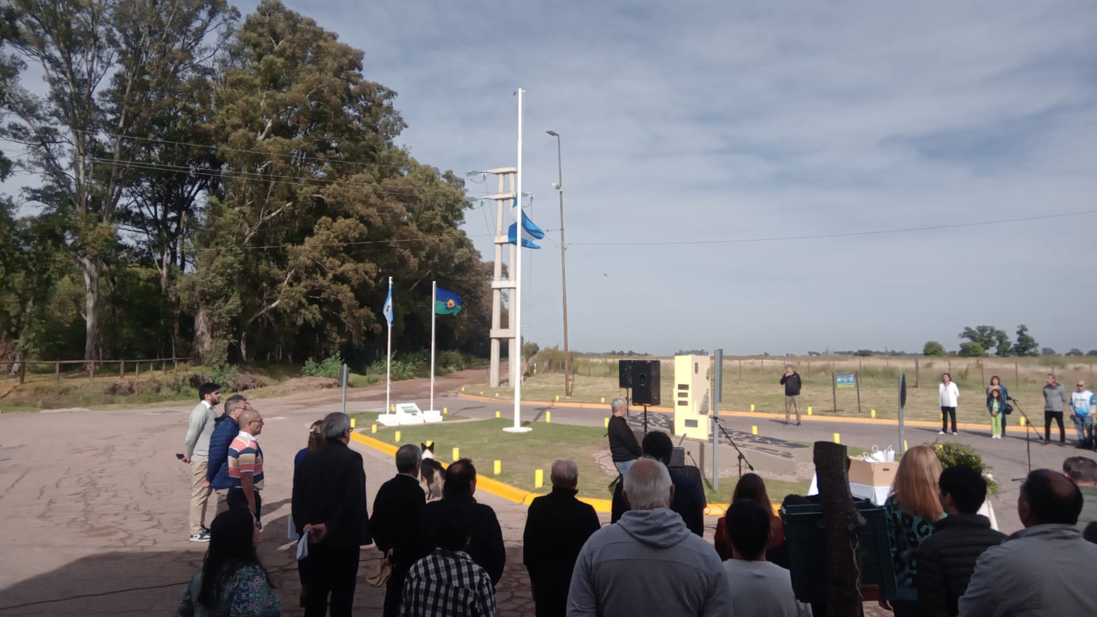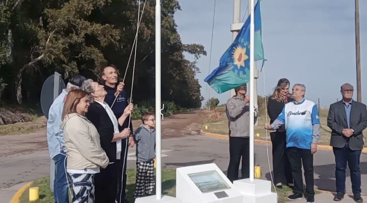 La bandera bonaerense fue llevada por el presidente del HCD Jorge Pablo Rosolén y a los vecinos Ruben Ferro y Alfredo Buil y la bandera nacional con motivo de Malvinas por Emilce Pocha Gardón, familiares de Tato Sánchez y Federico Galligo.