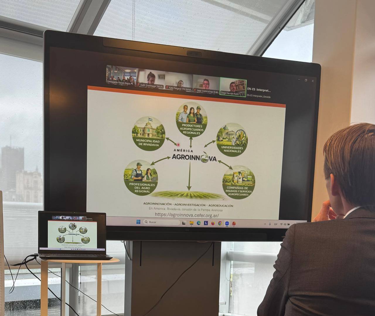 Durante el encuentro, el director del Centro de Formación en Investigación América Agroinnova, Diego Rotili, presentó los avances y aprendizajes logrados tras dos años de cooperación entre América Agroinnova, la Embajada del Reino de los Países Bajos en Argentina, universidades neerlandesas y empresas del país europeo.