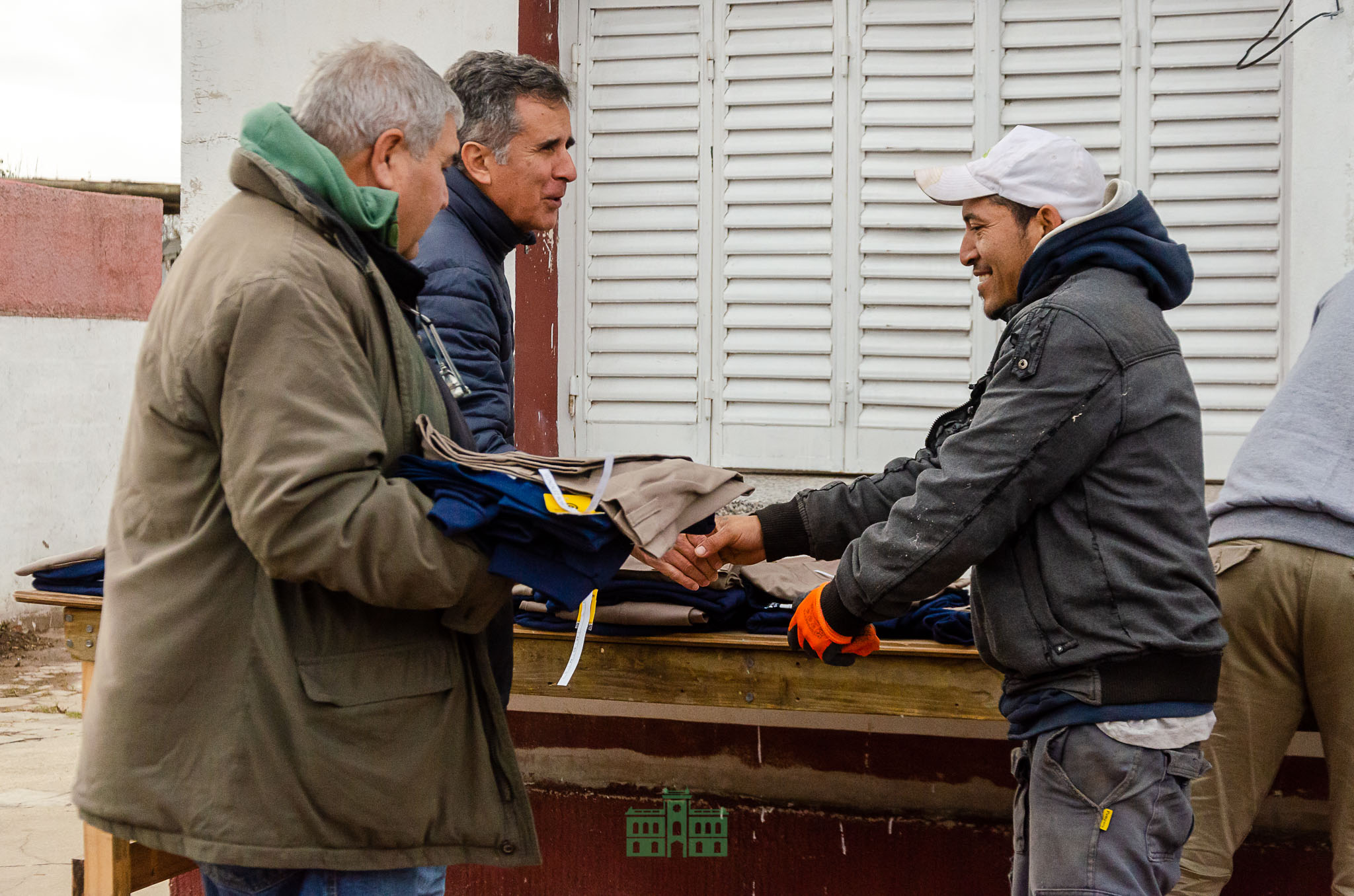 El intendente Juanci Martínez, junto al secretario de Gobierno, Sebastián Hernández, el jefe de servicios Urbanos, Edgardo Ustari y el Jefe del Corralón, Sergio Álvarez, hicieron entrega de nueva ropa de trabajo a los empleados del Corralón de América.