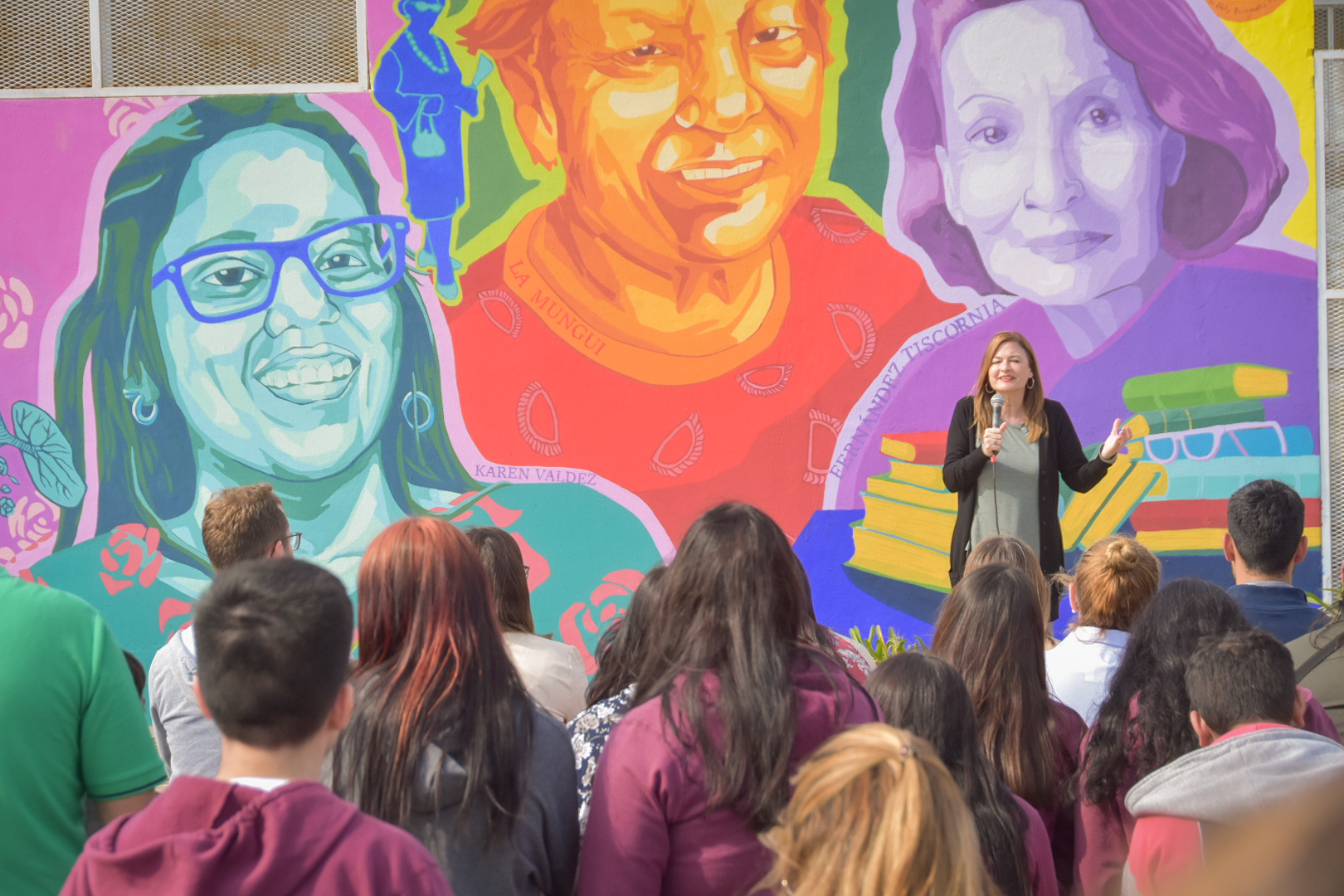 En el marco de la presentación, se realizó una reseña de Karen Valdez, Nelly Fernández Tiscornia e Irma Rosa “la Mungui” Caro, protagonistas del mural. Asimismo, las y los estudiantes de la institución leyeron fragmentos de obras trabajadas en la materia de Literatura vinculadas a la propuesta del programa, cantaron la canción “Sin Miedo” y realizaron una representación.