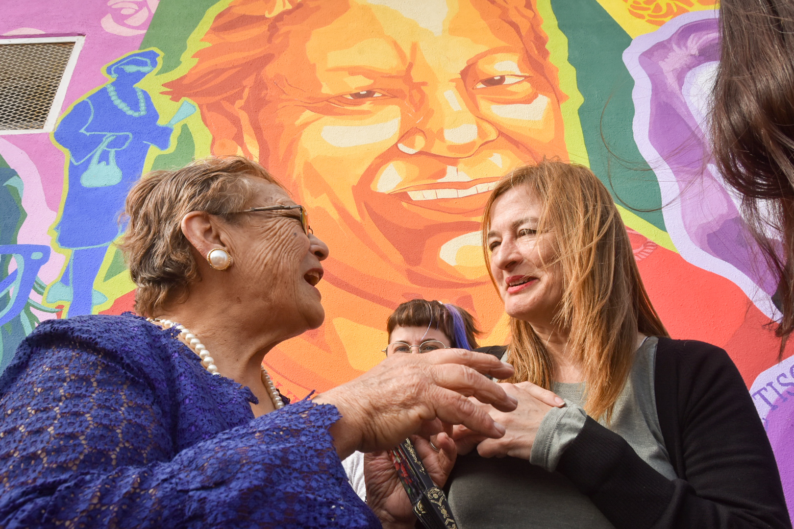 Las protagonistas elegidas para representar en el mural fueron Nelly Fernández Tiscornia, Karen Valdez e Irma Rosa López “La Mungui” . La primera fue una escritora, dramaturga y guionista de “situación límite” donde trabaja las hipocresías sociales y los conflictos entre generaciones. Karen Valdez es una joven que padece fibrosis quística. “La Mungui”, es una mujer de 77 años oriunda de Carlos Tejedor, que llegó en 1959 a América para cuidar niños por algunos días, pero se quedó para siempre. Las tres fueron seleccionadas por referentes de la comunidad por sus diferentes aportes.
