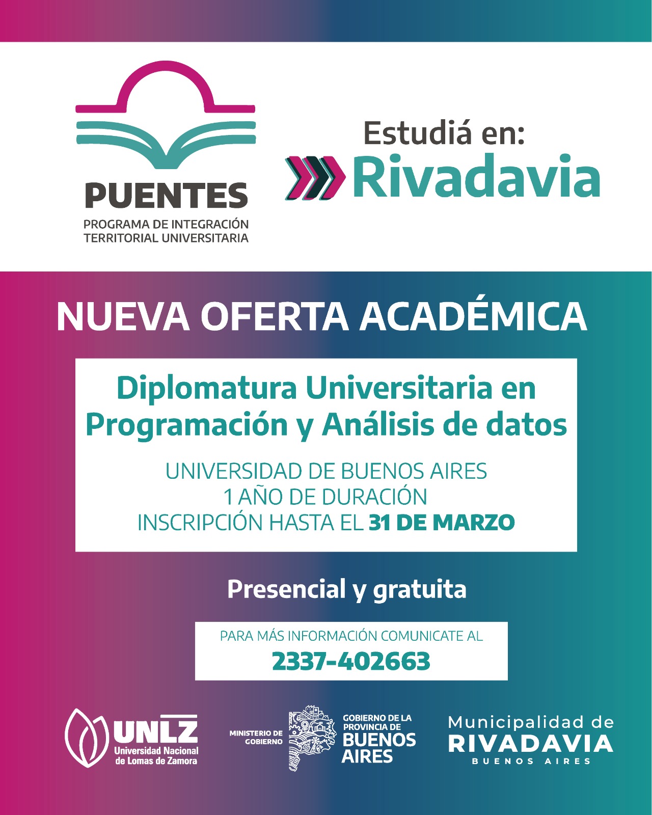 👨🏻🎓 La Municipalidad de Rivadavia, a través del programa provincial PUENTES, incorpora dos nuevas ofertas educativas para el nivel superior. Se trata de la de la Tecnicatura Universitaria en Construcciones, de la Universidad Nacional de Lomas de Zamora (UNLZ) y la Diplomatura en Iniciación a la Programación y Análisis de Datos, de la UBA.
