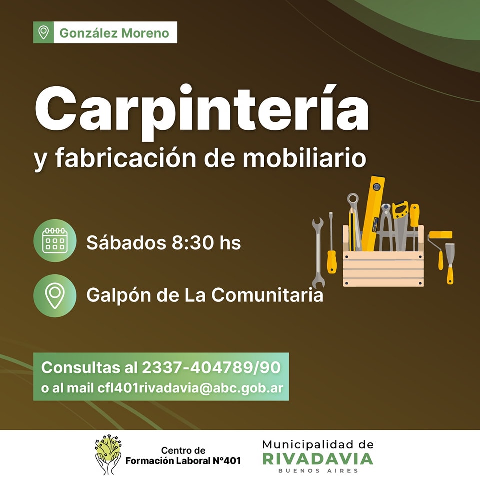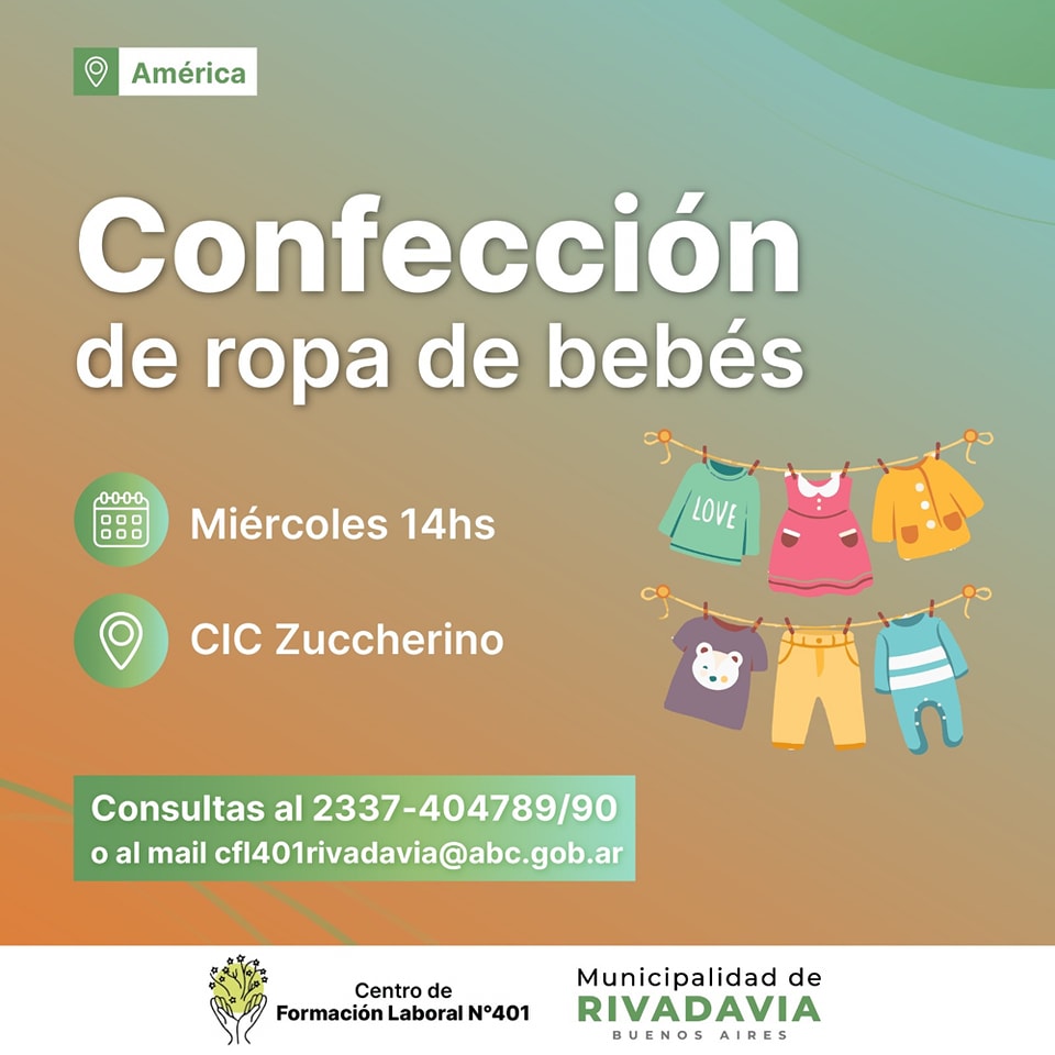 ‼️ Si querés más información de estos y otros cursos, acercate al Centro de Formación Laboral ubicado en el CIC, calle Lavalle y Eva Perón, o a las Delegaciones municipales, o comunicate por teléfono a los números 2337-404789/90, o por mail cfl401rivadavia@abc.gob.ar