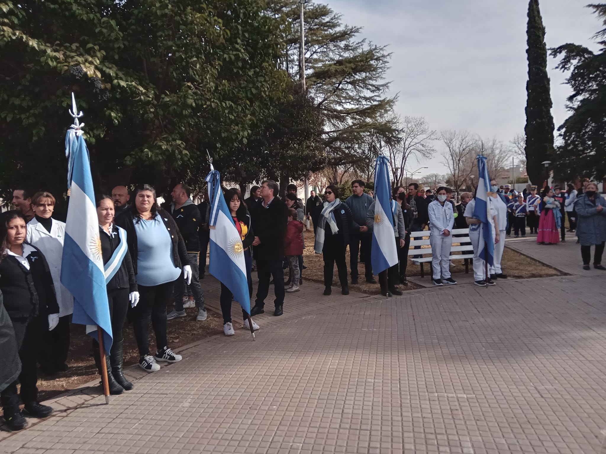 El acto comenzó con el ingreso del Pabellón Nacional a la plaza, portado por el Intendente Municipal Javier Ulises Reynoso, el Senador provincial, Juan Alberto Martínez, autoridades de gobierno, educativas e institucionales quienes lo izaron en el mástil principal.