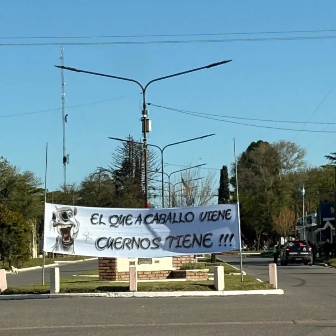 En la tela colgada estratégicamente podía leerse “El que a caballo viene cuernos tiene”!!! acompañado de la imagen de un caballo. Se desconoce si se trató de una broma, pero sí que no cayó de la mejor manera en quienes integran el contingente.