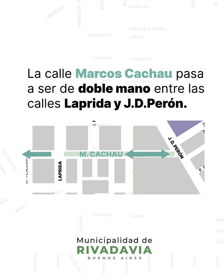 Con el objetivo de ordenar el tránsito vehicular en el área urbana, evitar accidentes y lograr una circulación más ágil, se estableció mediante Ordenanza Nº 3.202/2010 el sentido mano y contra mano en las calles Marcos Cachau (Altura Laprida hasta J.D. Perón). Esto tambien ocurre con la calle Italia (altura Laprida hasta H. Nieto).