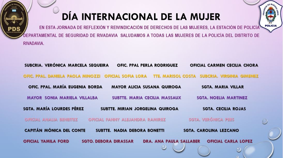 Este martes 8 de marzo el Comisario Javier Alejandro Pérez titular de la Jefatura Departamental de Rivadavia decidió homenajear a las mujeres que forman parte de la institución.