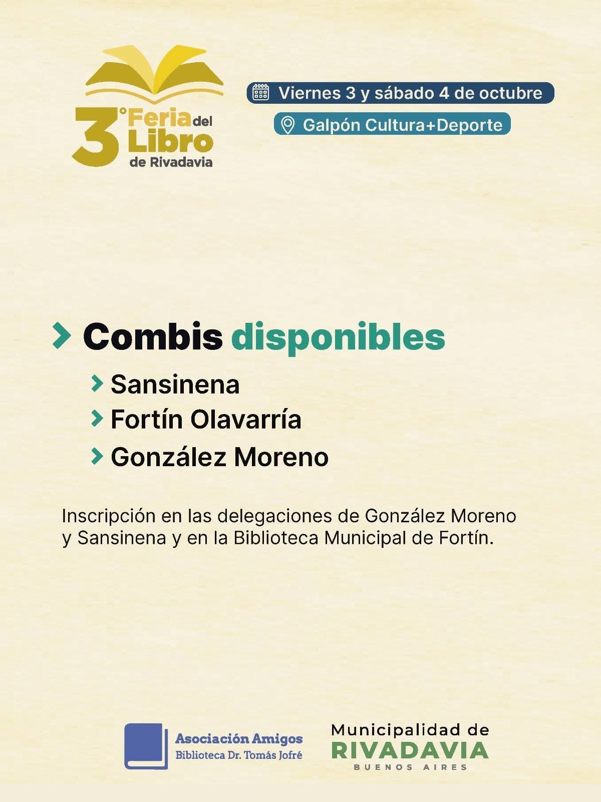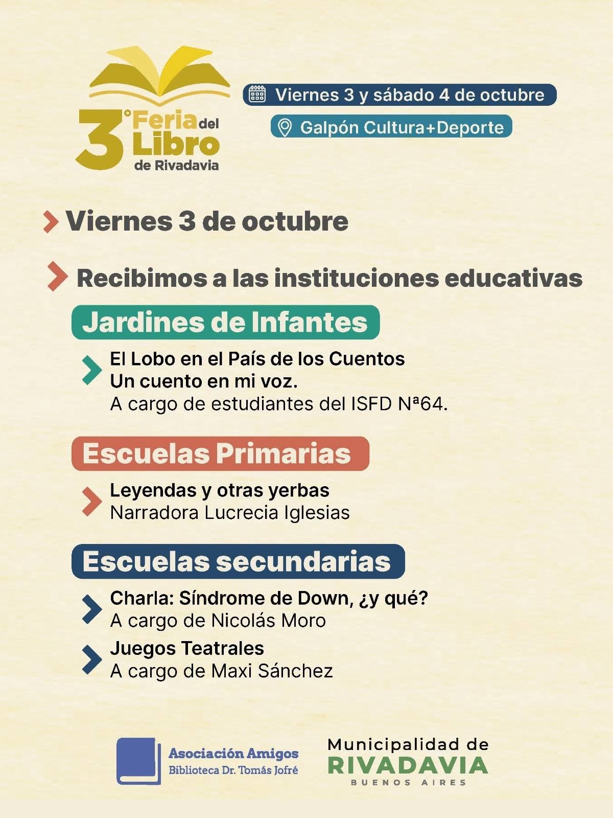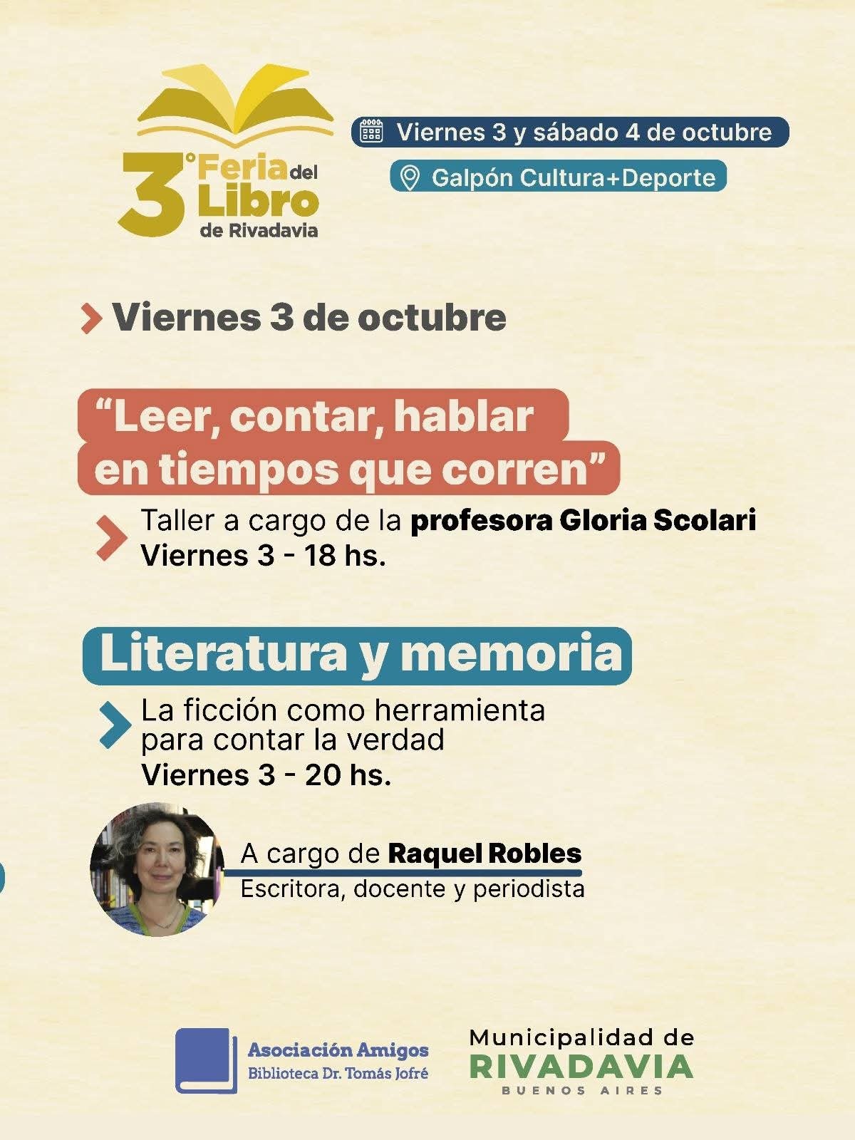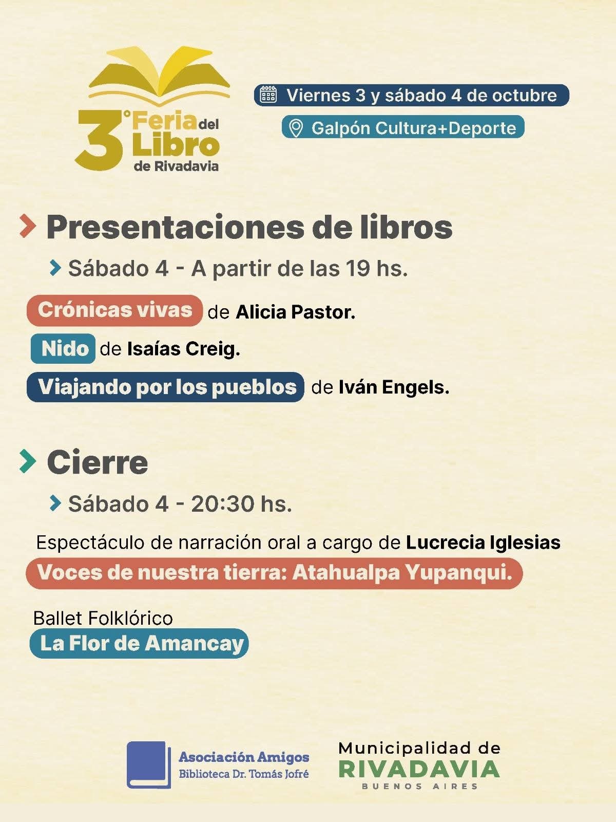 📚 Este viernes 3 y sábado 4 de octubre, te esperamos en la 3º Edición de la Feria del Libro de Rivadavia, organizada por la Asociación Amigos de la Biblioteca y la Municipalidad de Rivadavia, en el Galpón Cultura+Deportes.