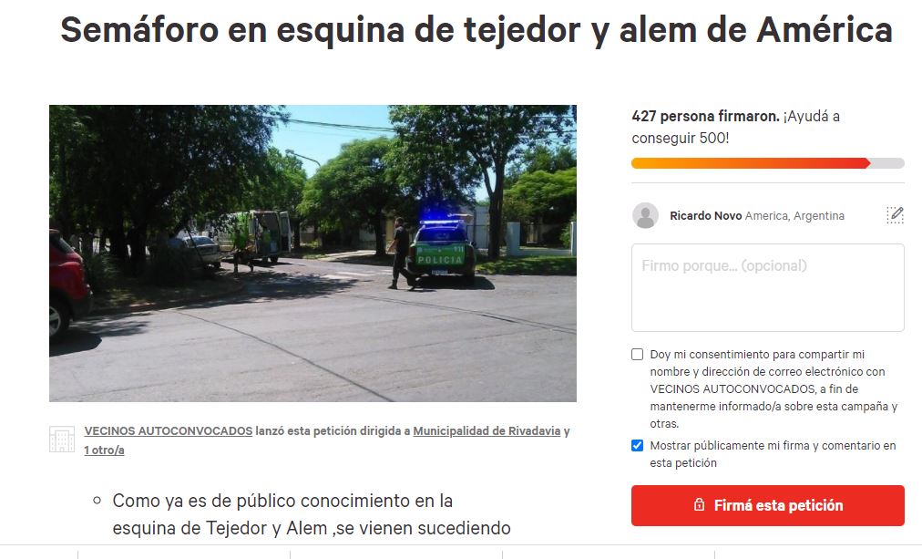 Ahora los vecinos del lugar a través de Change.org juntan firmas para presentarlas a la Municipalidad de Rivadavia y solicitar de esa manera la llegada de un semáforo que regule el tránsito en esa conocida esquina de América