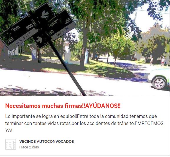 “Como ya es de público conocimiento en la esquina de Tejedor y Alem, se vienen sucediendo de hace años, ACCIDENTES muy impactantes, 2 muertes y varios heridos. Se ha intentado con loma de burro, señalizaciones varias y nada ha logrado parar la velocidad que desarrollan autos y motos que por allí transitan. Los vecinos pedimos un SEMÁFORO, creemos por lo ya explicado que es lo único que va a parar estos siniestros. AYÚDANOS a que no más gente salga lastimada, AYÚDANOS a través de un semáforo, a educar, AYÚDANOS a pasar los fines de semana sin sobresaltos! AYÚDANOS A PROTEGER VIDAS!