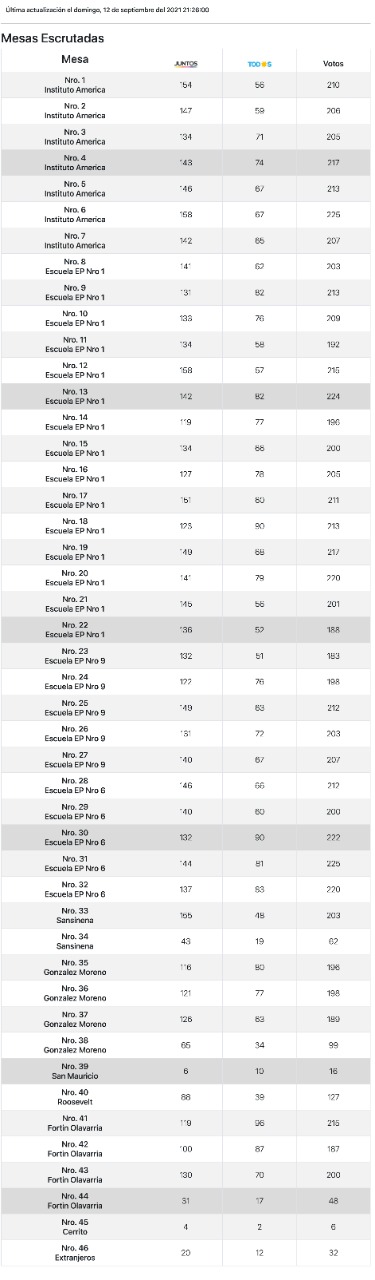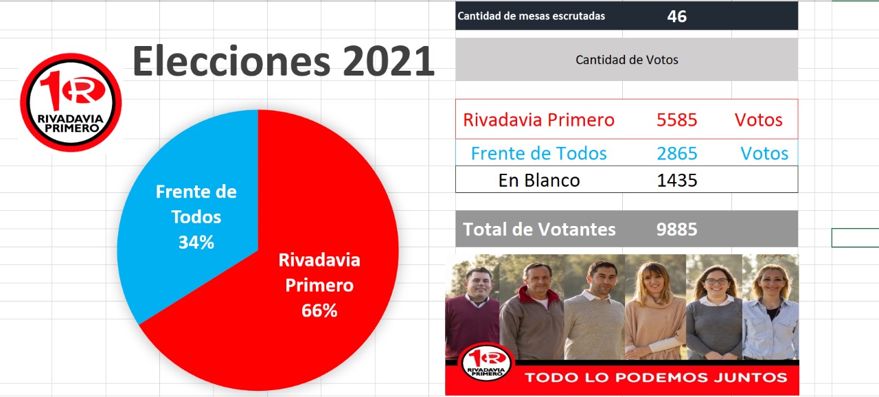 Así las cosas de las 46 mesas que hubo a lo largo y ancho de la geografía rivadaviense, solo en una la mesa N° 39 de San Mauricio, pudo imponerse el Frente de Todos con 10 votos a 6 de Rivadavia Primero. En las otras 45 mesas el oficialismo logro una victoria muy importante en cuanto a los números pero también contundente desde el punto de vista de lo que los vecinos eligieron.