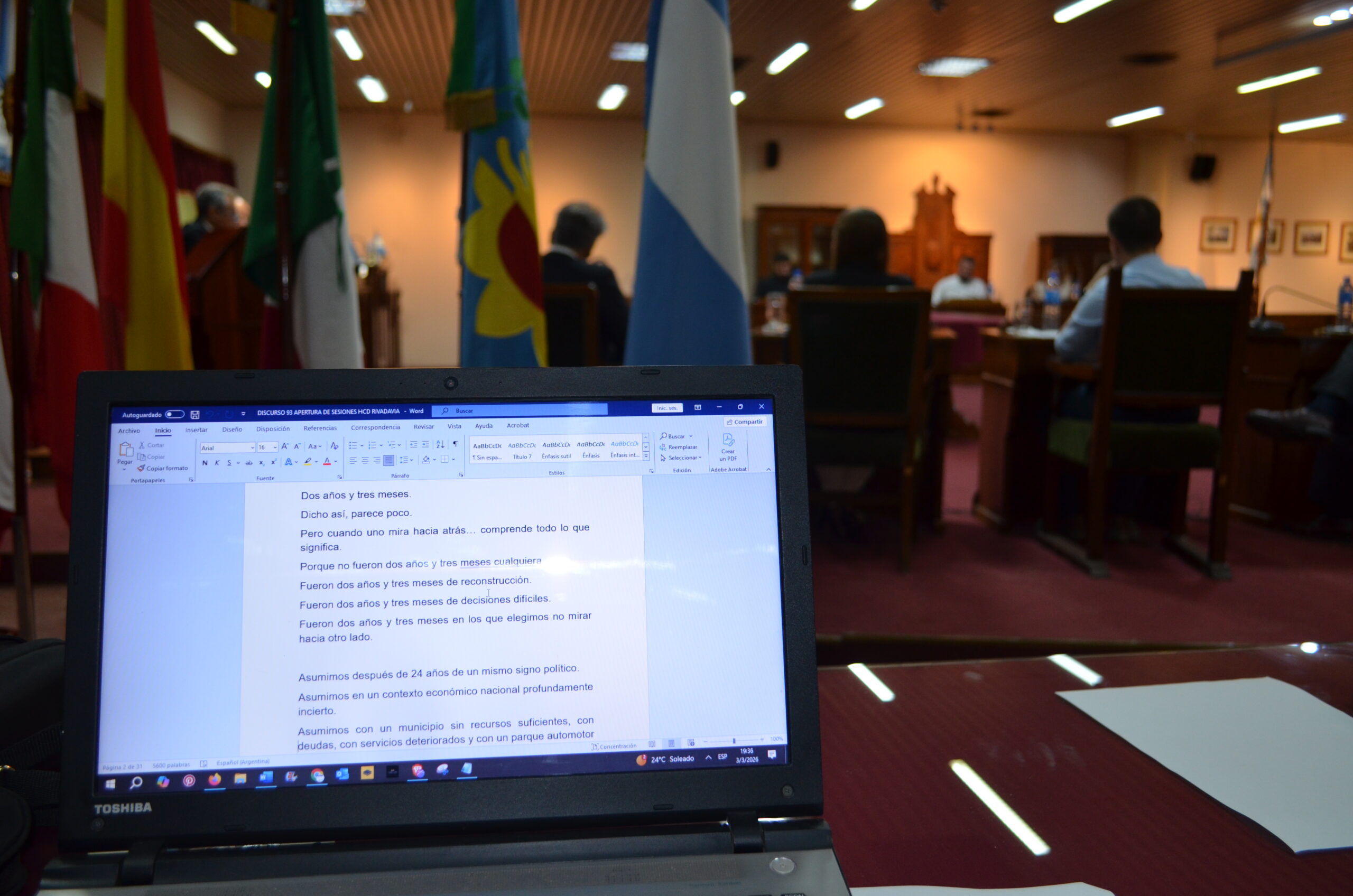 En la noche del martes 3 de marzo, en el recinto del Honorable Concejo Deliberante de Rivadavia, el intendente municipal Juanci Martínez dejó inaugurado el 93° período de Sesiones Ordinarias con un discurso centrado en la gestión, la planificación a largo plazo y el ordenamiento del Estado local.