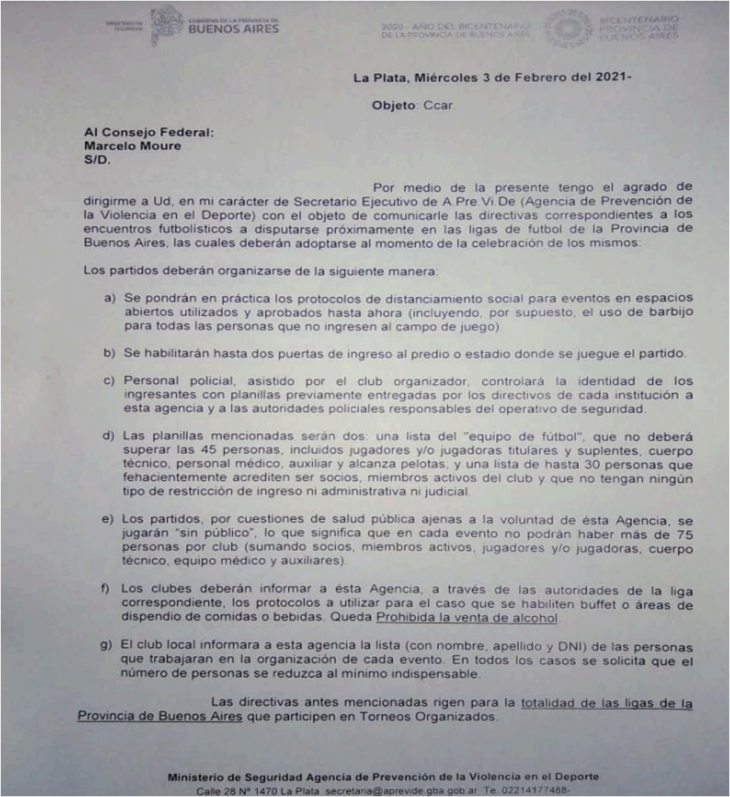La nota aclara en su punto e que ‘por disposiciones ajenas a esta Agencia, en cada evento no podrá haber más de 75 personas por club’ sumados todos los integrantes y auxiliares.