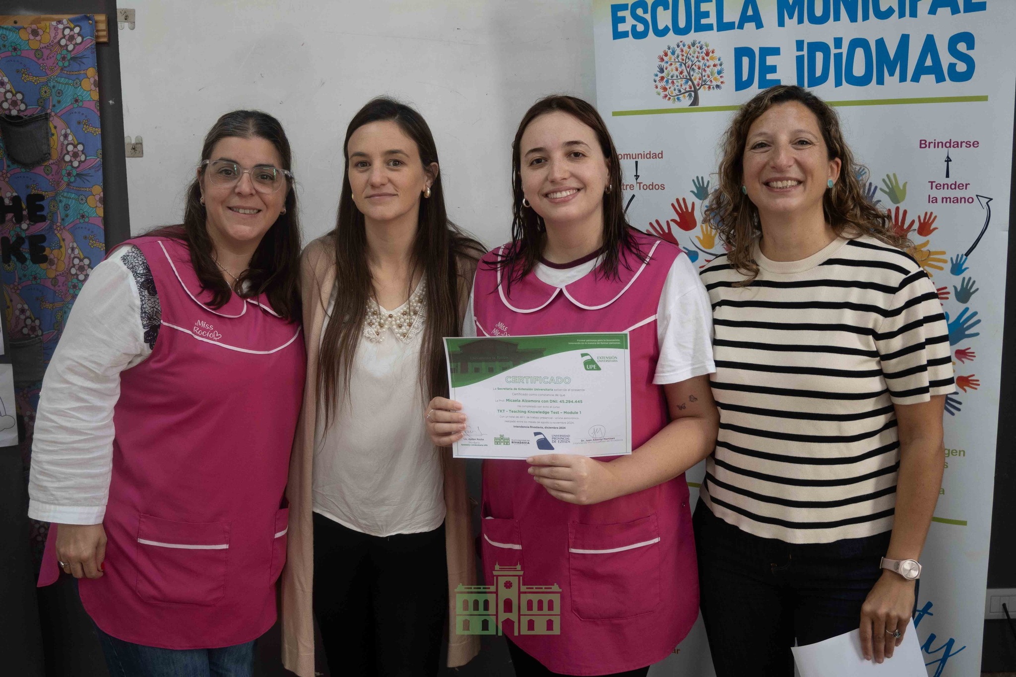 Durante la jornada, la directora de Educación, Mercedes García Duperou, y la coordinadora de la Escuela Municipal de Idiomas, Rocío Hernández, entregaron los certificados correspondientes al primer módulo a las profesoras que participaron de la capacitación.