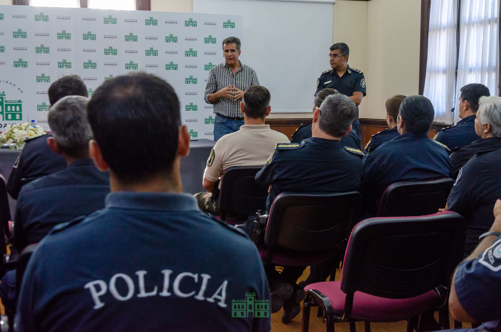 El lunes en el Salón Blanca Coyne, el intendente Municipal Juanci Martínez reconoció en un acto a todo el personal policial que se desempeña en el distrito de Rivadavia, destacando la labor y el compromiso con el cual desempeñan su tarea diaria.