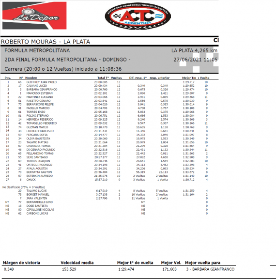 El “Teti” revirtió el abandono de ayer, con un muy buen 4° puesto, seguido de Luciano Martínez, también de gran avance, Genaro Rasetto, Felipe Bernasconi, Marcio Facello, Enzo Torres y Stéfano Polini, cerrando el top ten final en su debut. En el campeonato, Esteban “Teti” Mancuso se mantiene como líder con 387 puntos, siendo escoltado por Gianfranco Bárbara con 329,5; tercero Blas Séfchek 321; cuarto Valentín Jara 301,5; quinto Federico Hermida 300, en total suman puntos 62 pilotos. La próxima fecha será el 18 de Julio, en autódromo a confirmar.