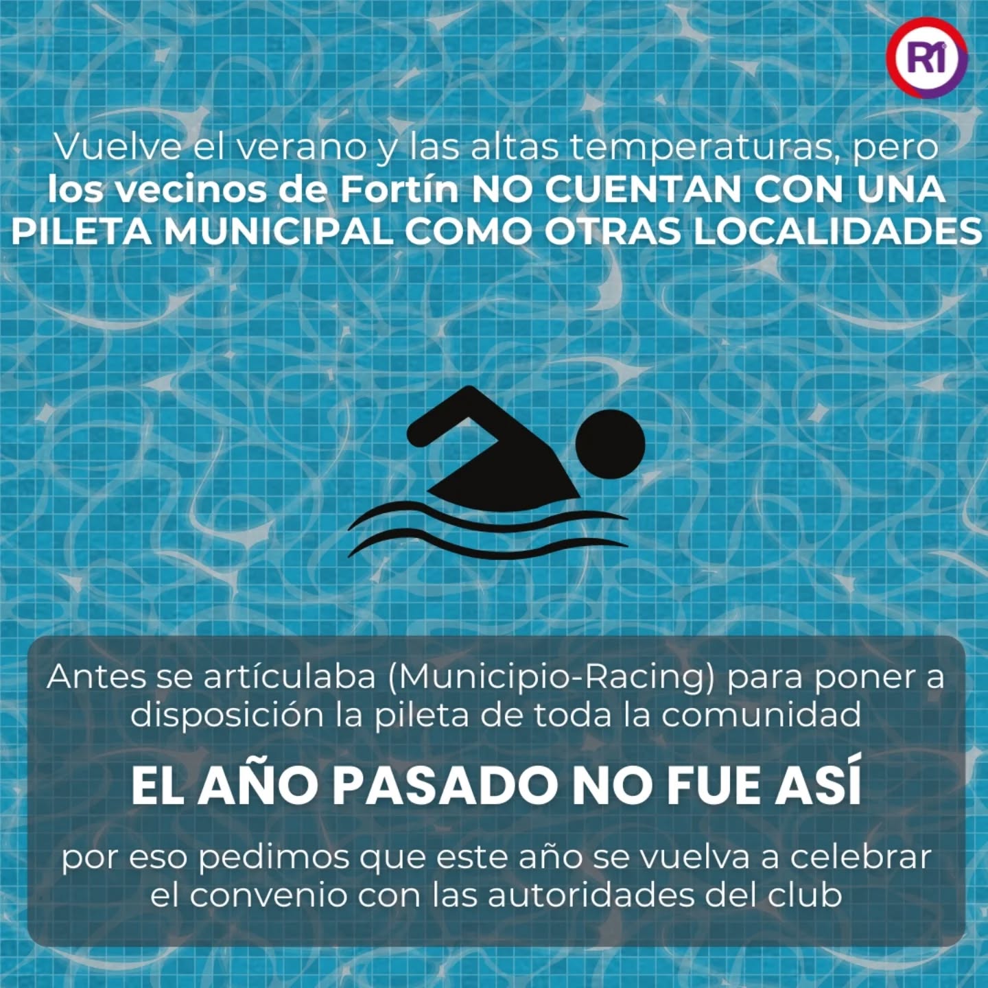 Desde Rivadavia Primero pedimos que se retome el convenio con Racing Fútbol Club para que, como siempre, la comunidad pueda acceder a la pileta durante el verano.