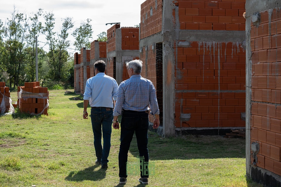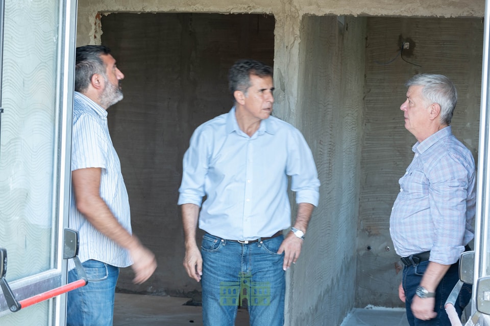 El intendente Juanci Martínez, junto al secretario de Gobierno Sebastián Hernández, el secretario de Obras Públicas y Hábitat, Arq. Juan Dufourc, y el secretario de Salud, Lic. Jorge Gayoso, recorrieron la obra del nuevo Centro de Salud en el Barrio Pos Vías y las 43 viviendas.