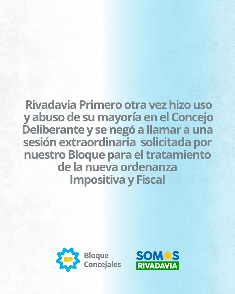 El bloque opositor de Rivadavia Primero, haciendo uso y abuso de la mayoría, se negó nuevamente a dar tratamiento en Sesión Extraordinaria, solicitada por este bloque, para debatir la Ordenanza Impositiva y Fiscal.