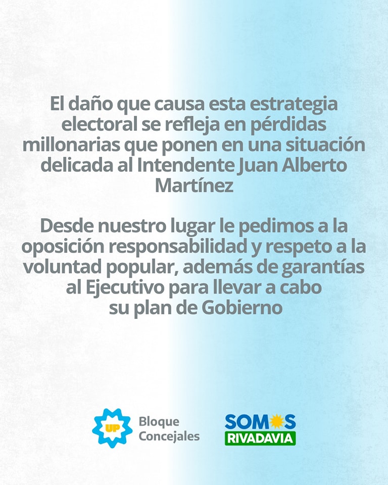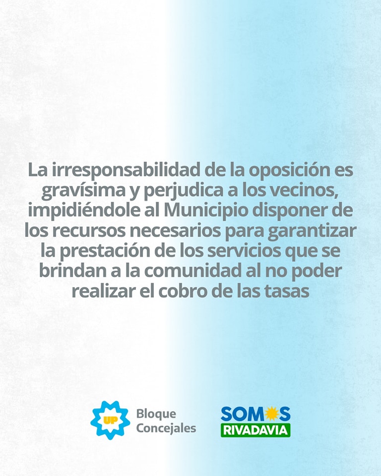 La irresponsabilidad de Rivadavia Primero los rivadavienses es grandísima, ya que impide al municipio la posibilidad de disponer de los recursos para garantizar la prestación de todos los servicios que se brindan al no poder realizar el cobro de tasas municipales de este año.
