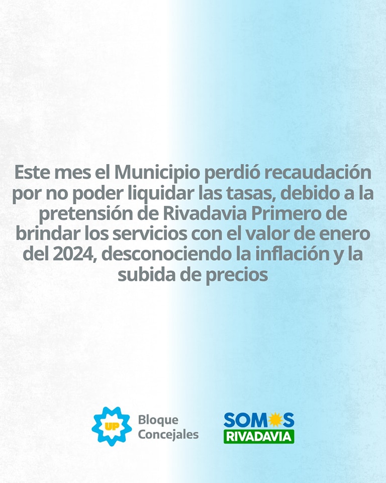 Este mes el Municipio de Rivadavia perdió recaudación por poder liquidar las tasas debidamente. Parece que la oposición pretende que se brinde el servicio con el valor de enero del 2024, desconociendo la inflación y variación de precios.