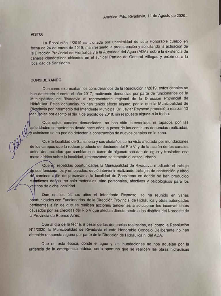 La concejal agregó que “esos canales existen desde 2017, el Intendente Reynoso hizo en 2018 alrededor de 13 denuncias de las cuales nunca tuvimos respuestas ni resultados a pesar de hacer las gestiones desde Municipalidad y el Concejo Deliberante ante las autoridades del Agua y de Hidráulica y como no se obtuvo ninguna respuesta el año pasado hicimos este proyecto pidiendo que se tapen estos canales clandestinos que son los que después desbordan poniendo en riesgo a la localidad de Sansinena”.