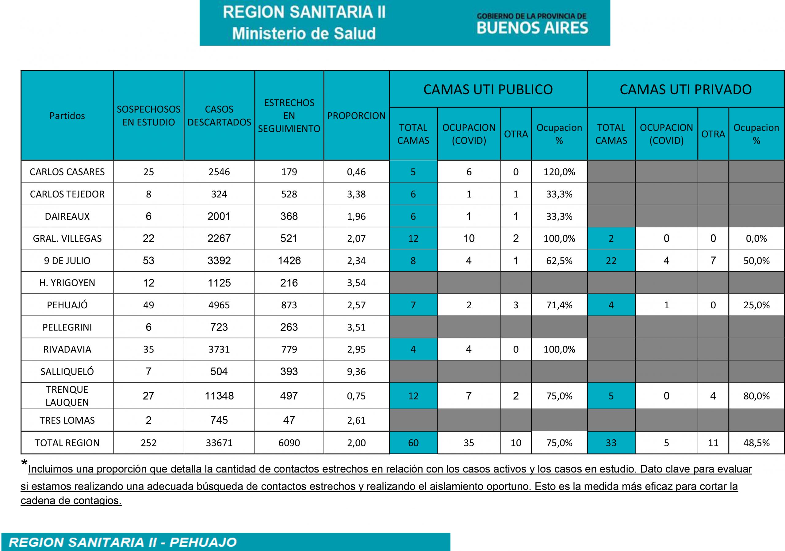 En cuanto a la tasa de casos Covid activos cada 100.000 habitantes, Rivadavia se encuentra en el 3° lugar (1338), detrás de Carlos Casares (1523) y Trenque Lauquen (1359). Luego siguen Carlos Tejedor (1.268), 9 de Julio (1.140), Pellegrini (1.139), Daireaux (1.000), Pehuajó (802) y Gral. Villegas (691). La tasa promedio de la Región Sanitaria II es de (1.019).