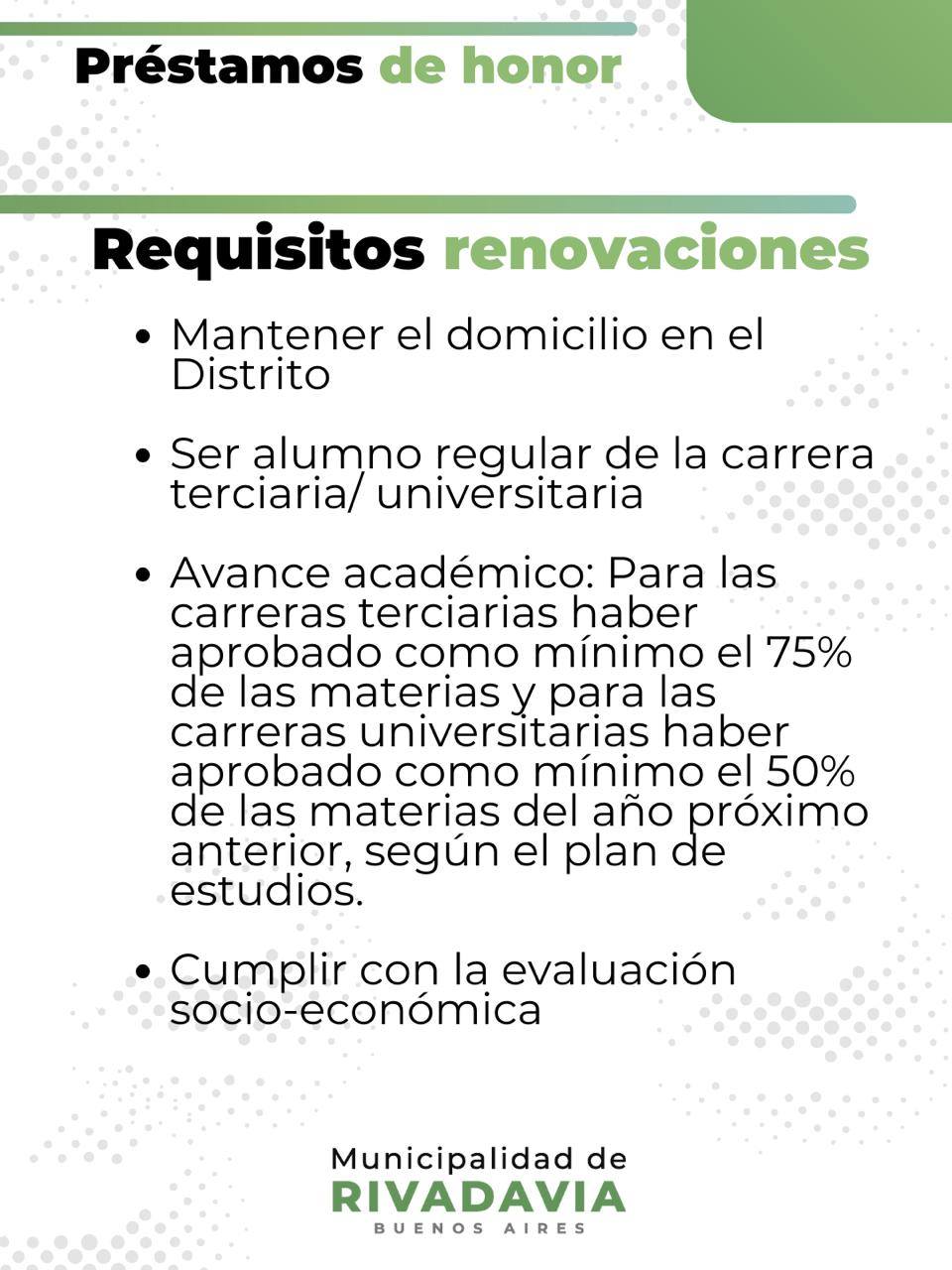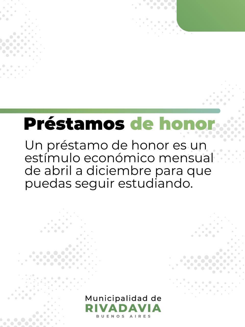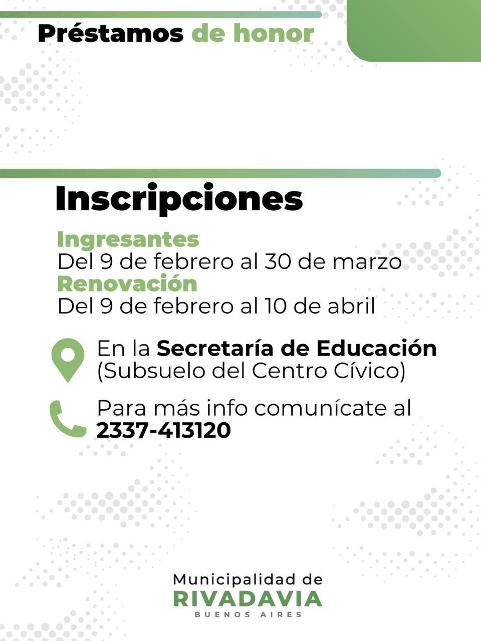 La Dirección de Educación de la Municipalidad de Rivadavia informa que a partir del lunes 9 de febrero queda abierta la inscripción al programa Préstamos de Honor, una propuesta destinada a estudiantes de nivel terciario y universitario del distrito.