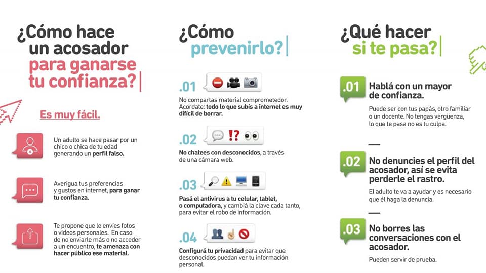 El grooming es la acción deliberada de un adulto de acosar sexualmente a un niño, niña o adolescente mediante el uso de Internet, a través de comunicaciones electrónicas, telecomunicaciones o cualquier otra tecnología de transmisión de datos como redes sociales, páginas web, aplicaciones de mensajerías como whatsapp u otras plataformas.