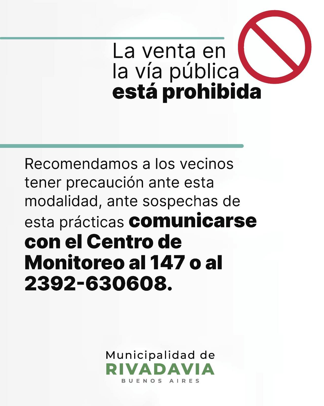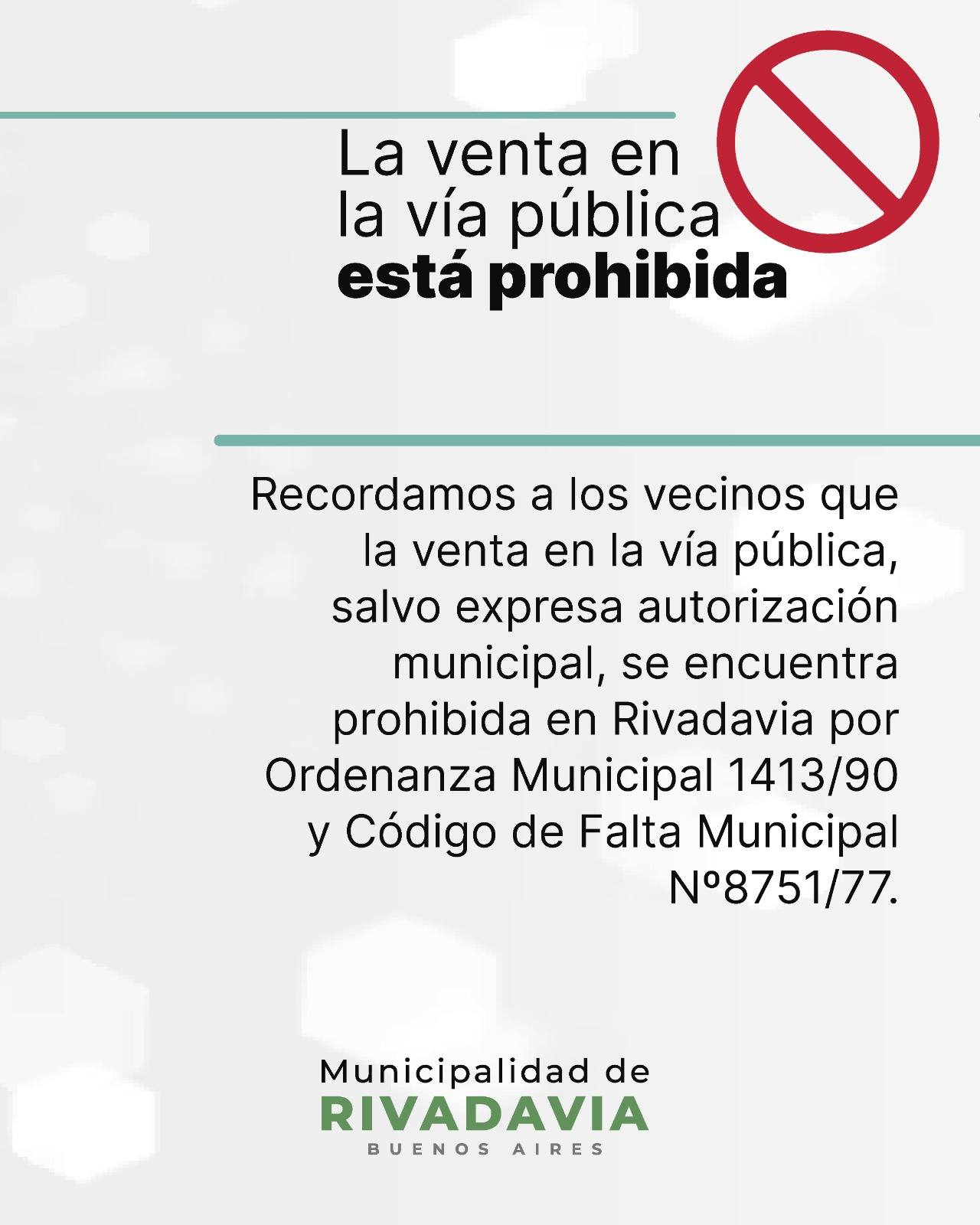 La Municipalidad de Rivadavia recuerda a los vecinos que la venta en la vía pública, salvo expresa autorización municipal, se encuentra prohibida en Rivadavia por Ordenanza Municipal 1413/90 y Código de Falta Municipal Nº8751/77.