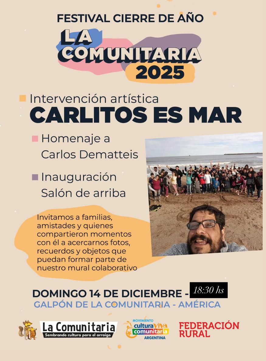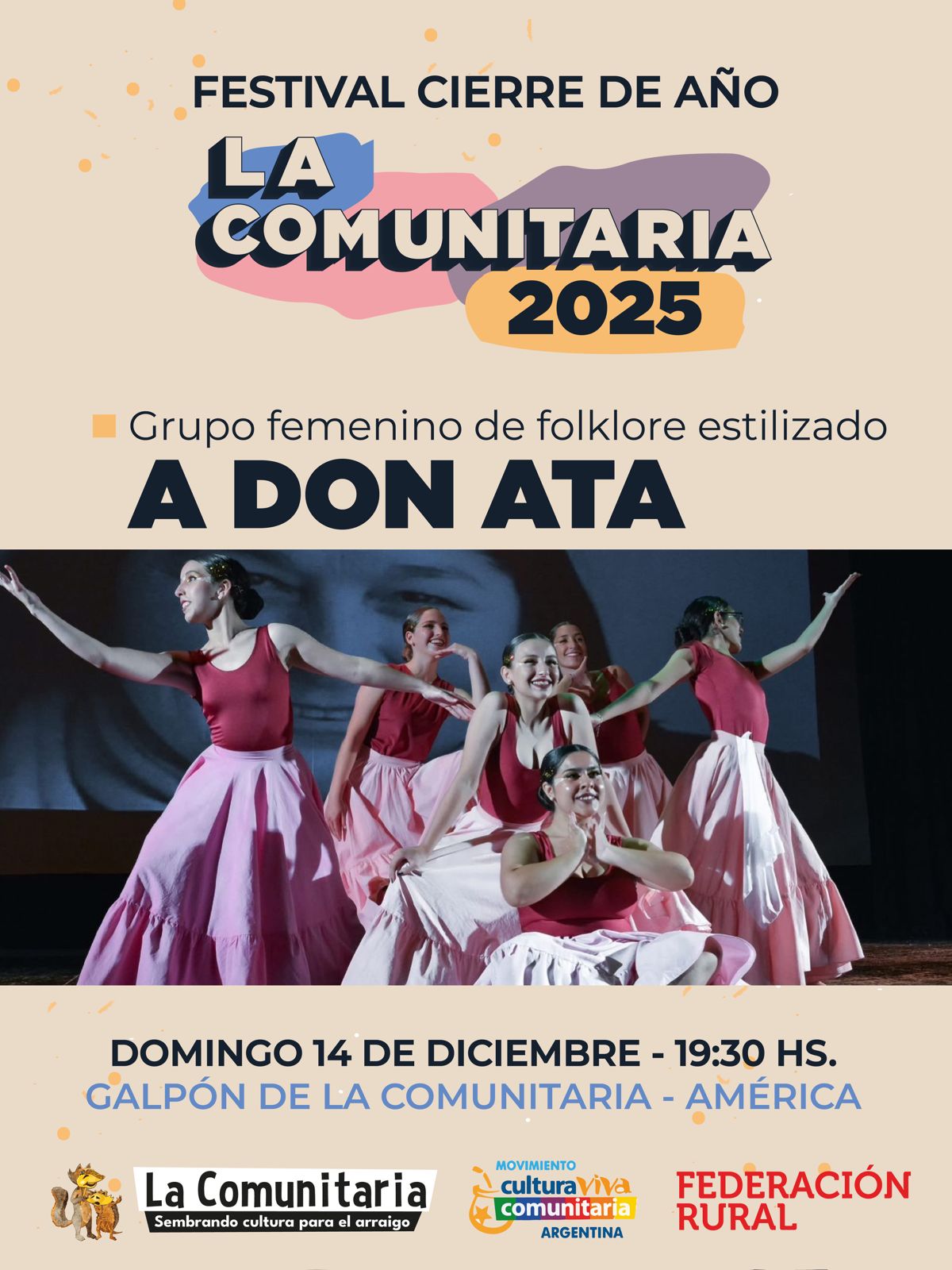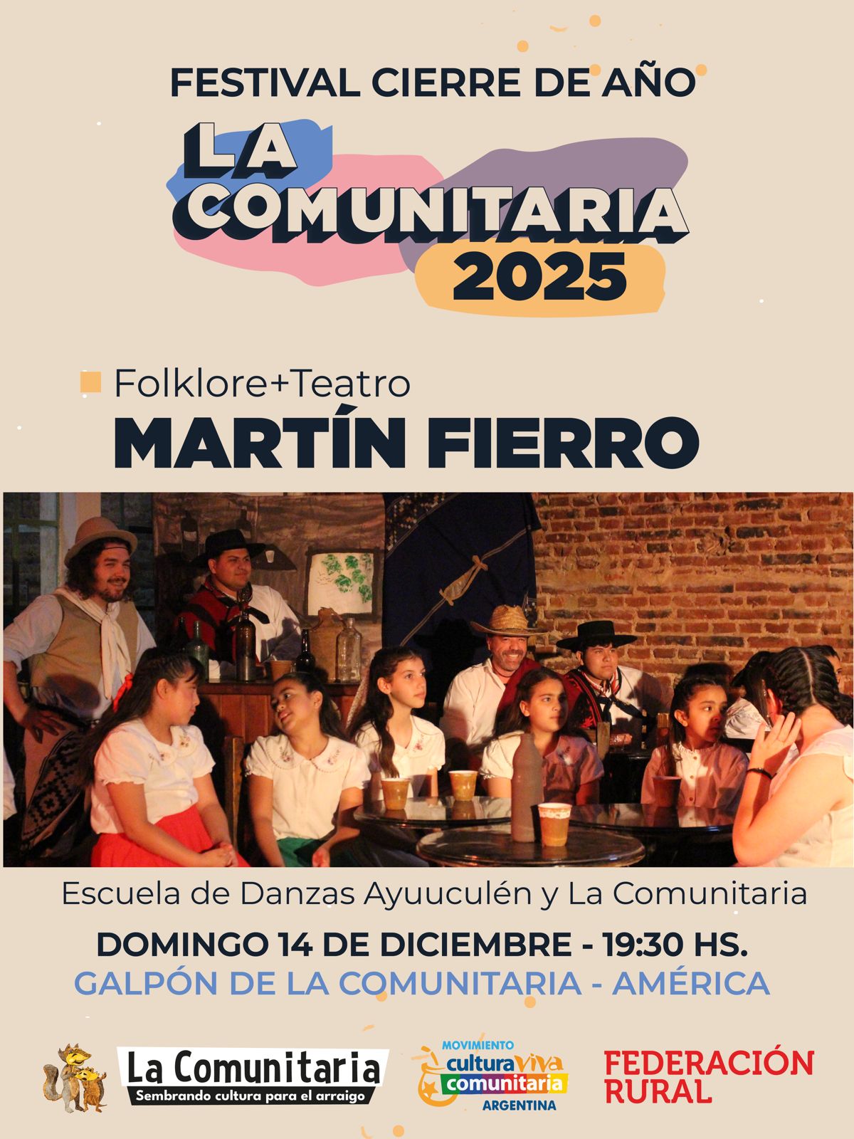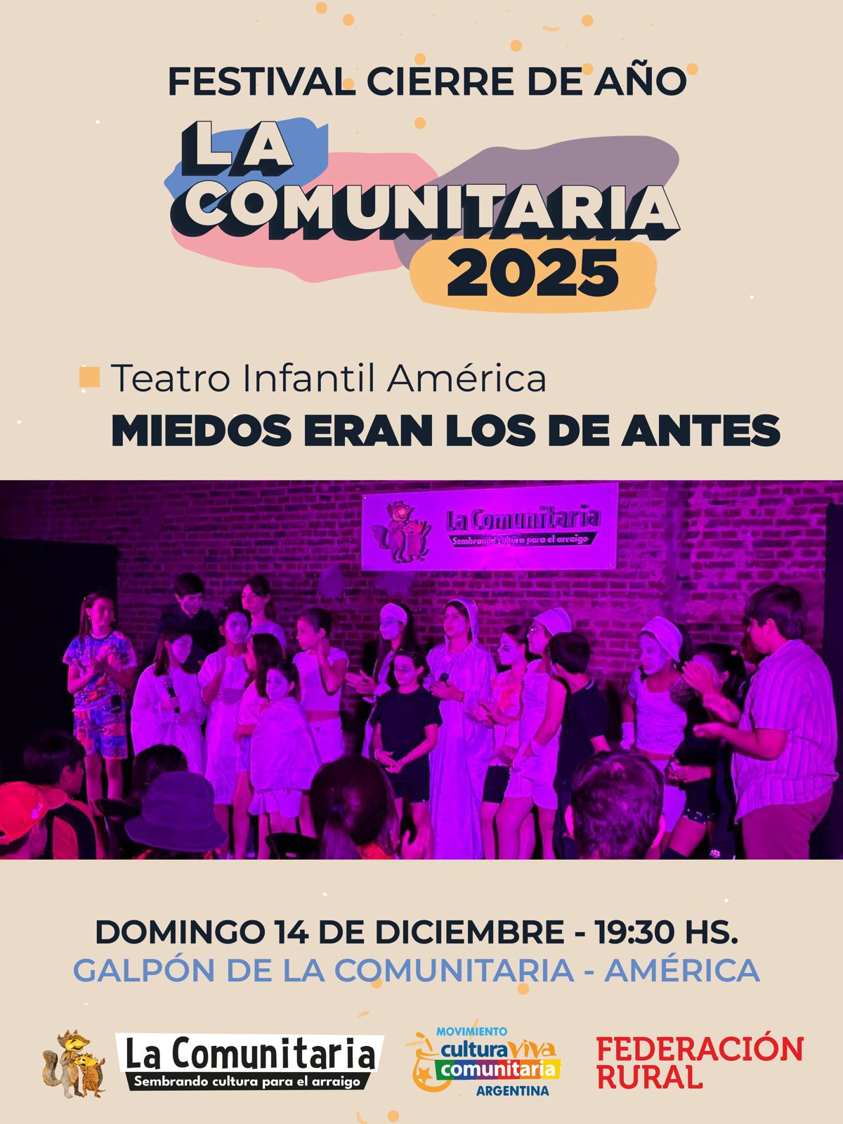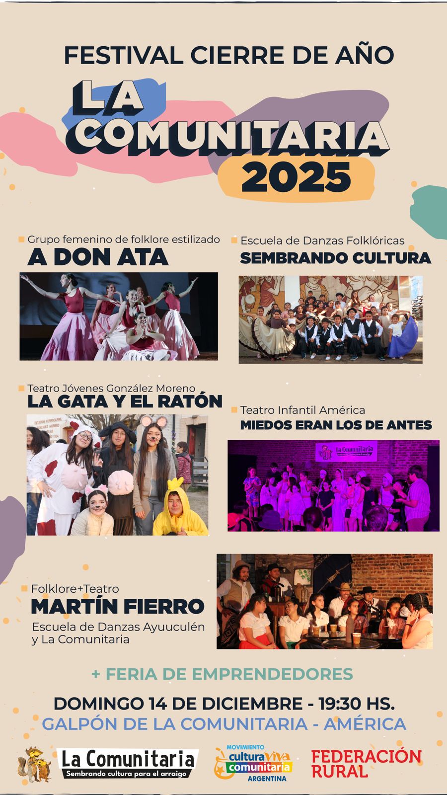 El domingo 14 de diciembre La Comunitaria despide el 2025 a puro teatro y folklore. Desde las 19:30 hs, en el Galpón de La Comunitaria de América y con el acompañamiento de la feria de emprendedores.