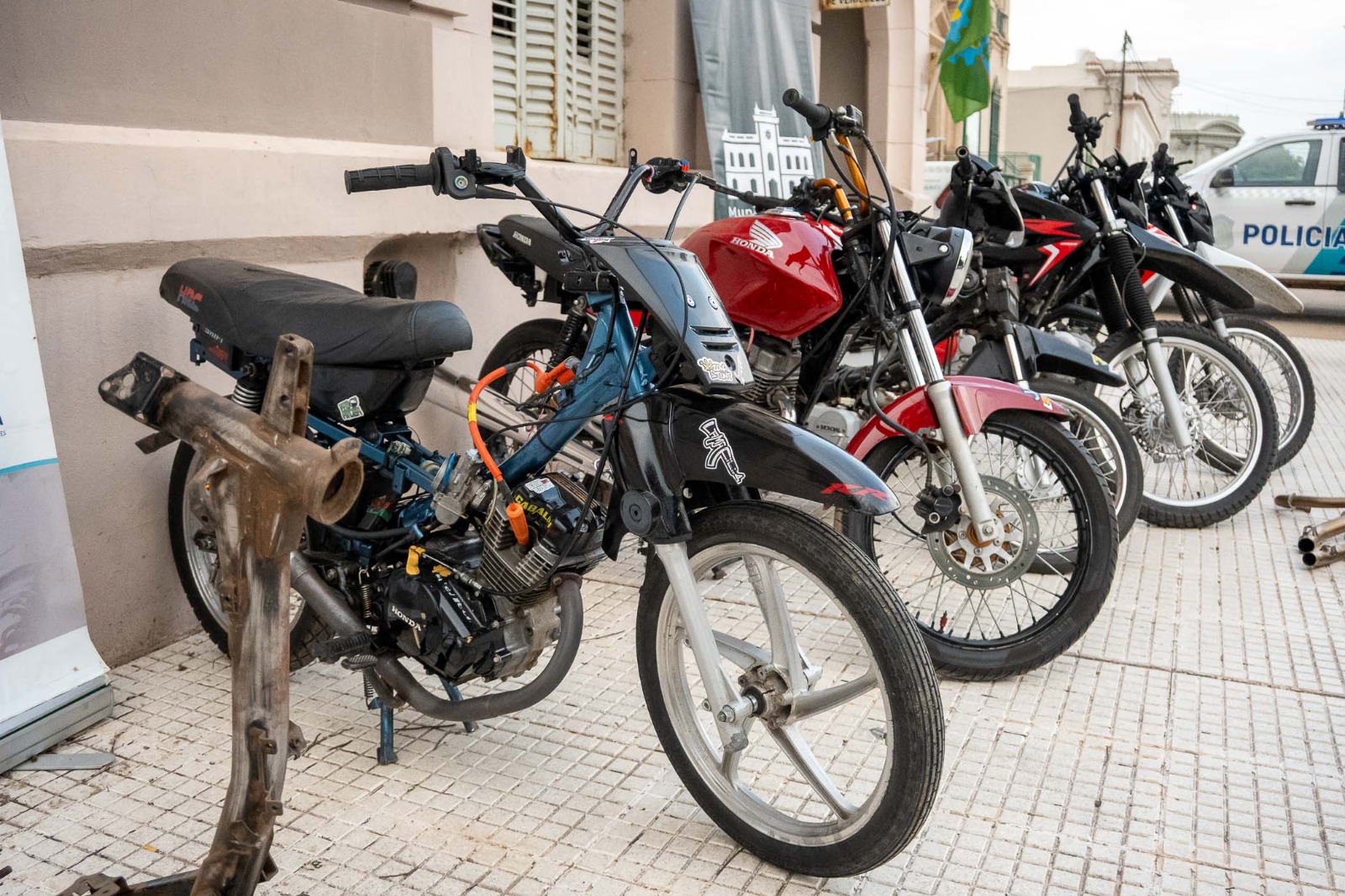 En los objetivos establecidos en la ciudad de América, debido a conductas temerarias “picadas” que culminaron con un peatón lesionado, además de realizar contaminación acústica, se logró el SECUESTRO: de una Honda modelo XR, color blanca, una Honda XR 200 cc color negra, una Honda XR 150 cc color blanca, una Honda CG Titán color roja, una motocicleta 110 cc sin marca visible con motor Honda y un cuadro de 110 cc, varios caños escapes no reglamentarios y autopartes varias.
